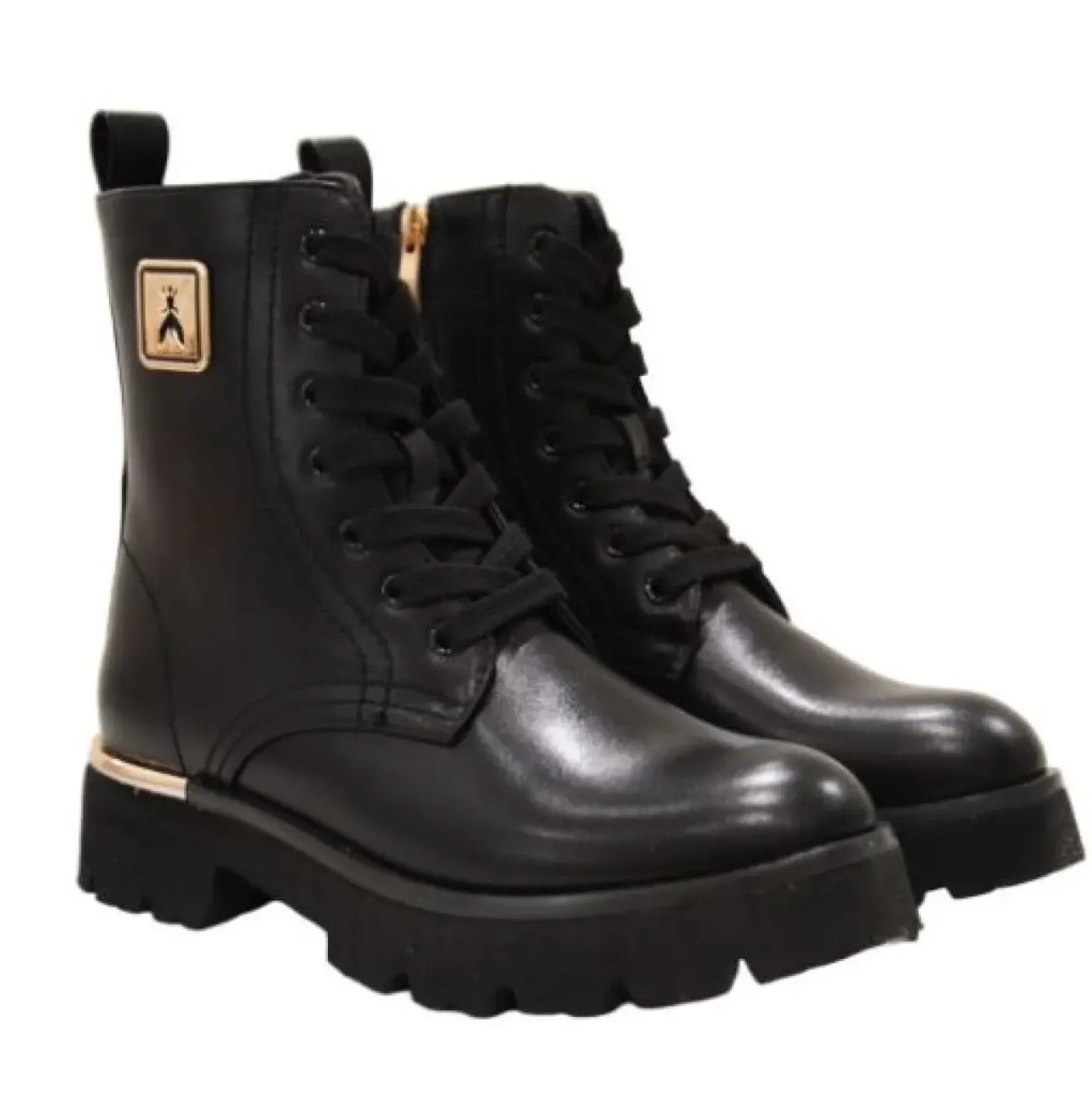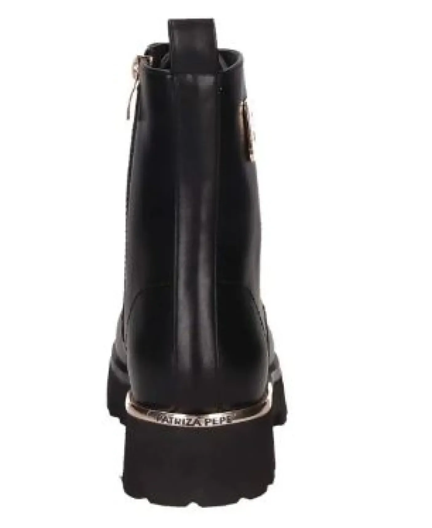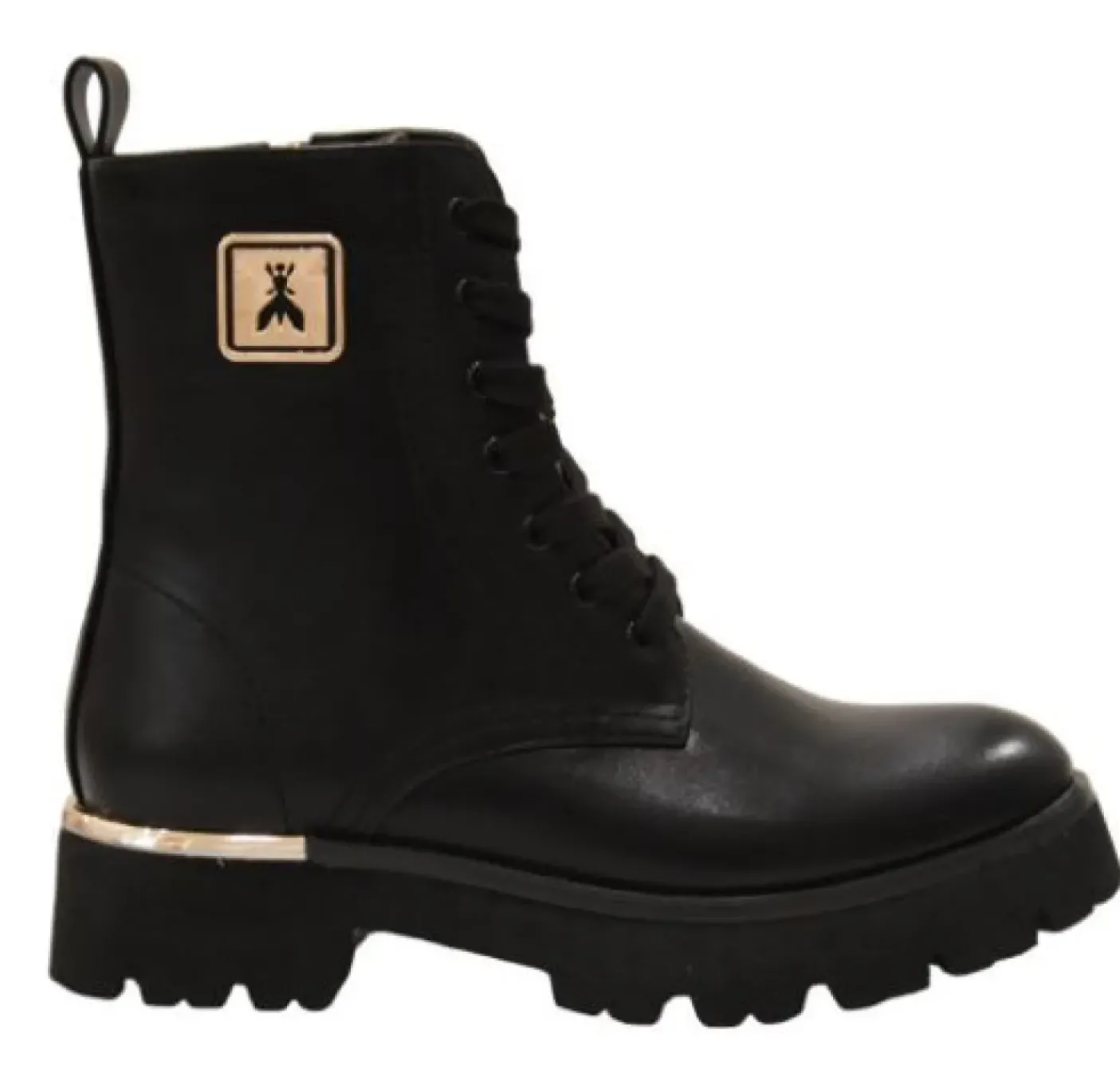 Anfibio in ecopelle con applicazione metallica logata gold. Rivestito internamente in ecopelle e pelle. Chiusura lacci 7 fori e zip laterale. Fondo gomma 3cm