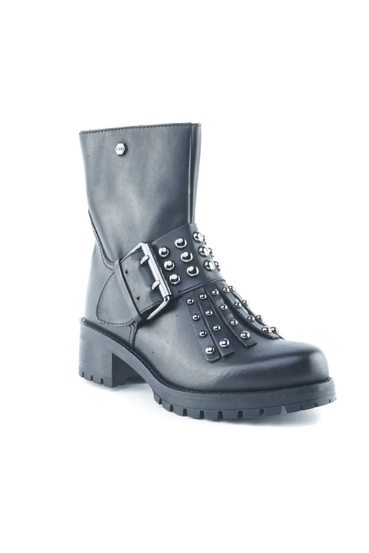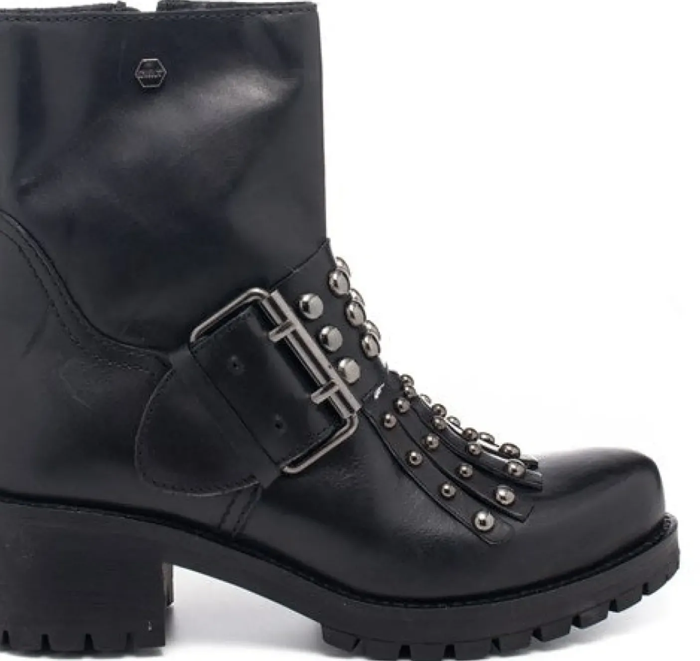 Anfibio in pelle con fibbia decorativa e frange con borchie color argento. Fondo in gomma. Chiusura con zip