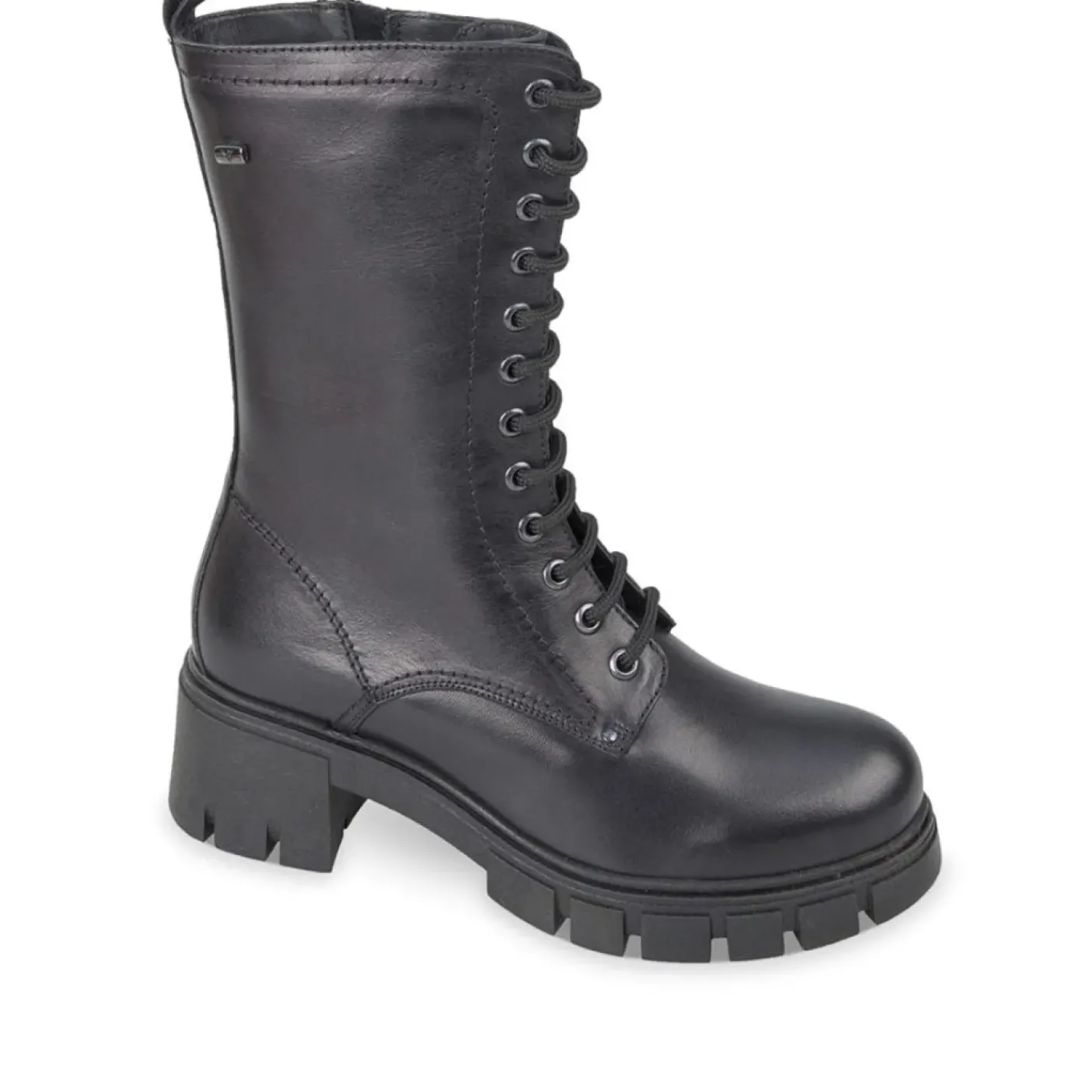 Anfibio in vera pelle morbida. Rivestito internamente in caldo tessuto e pelle. Soletta in cuoio. Fondo gomma. Chiusura con lacci e zip laterale.