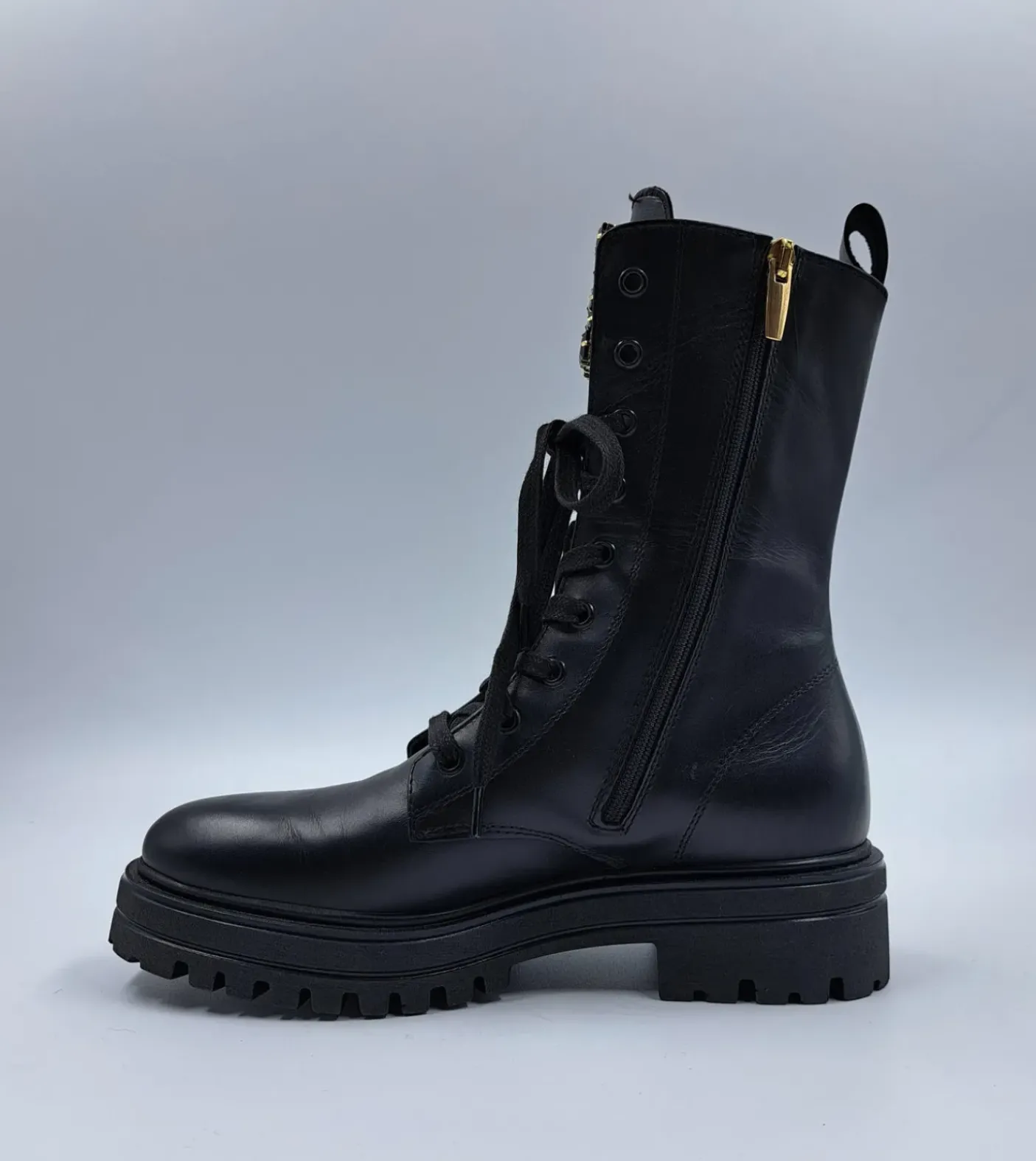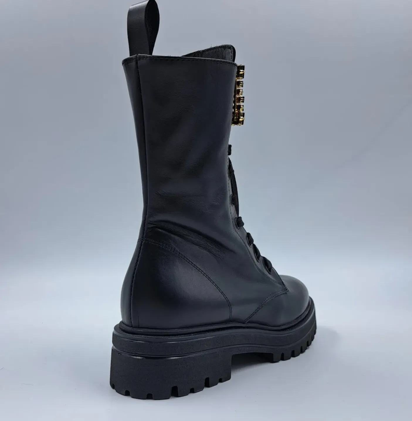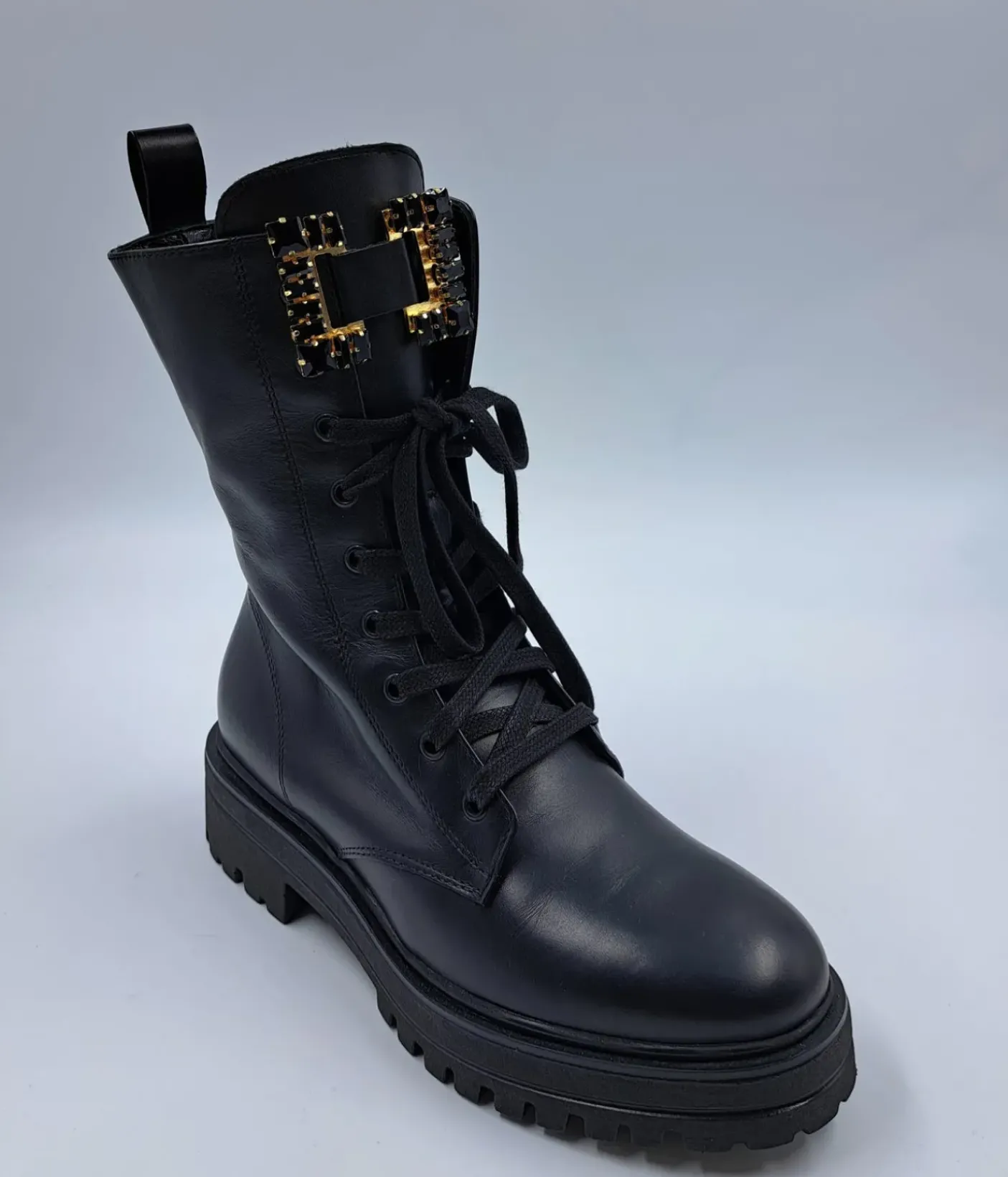 Anfibi in vera pelle, rivestito internamente in pelle. Applicazione strass neri metallo gold sulla linguetta. Chiusura con lacci. Fondo gomma.