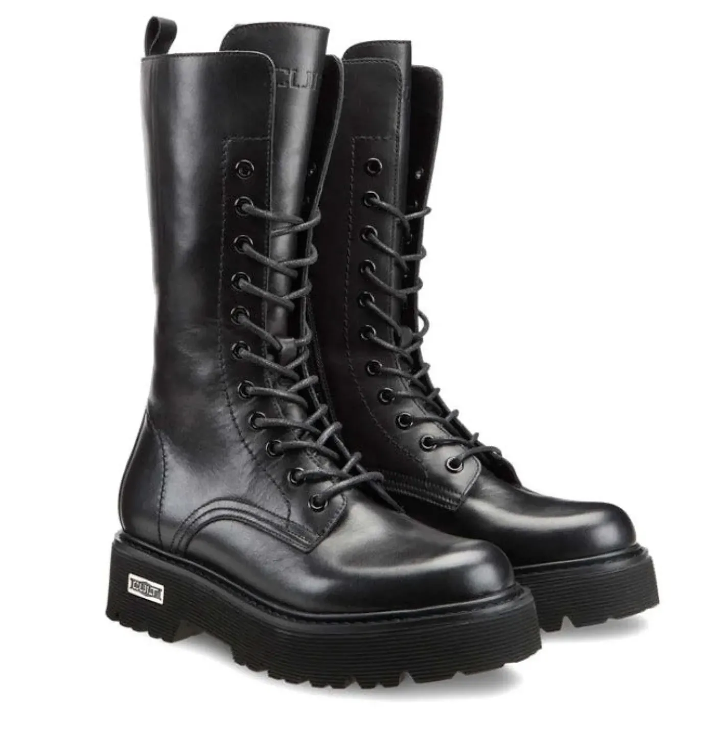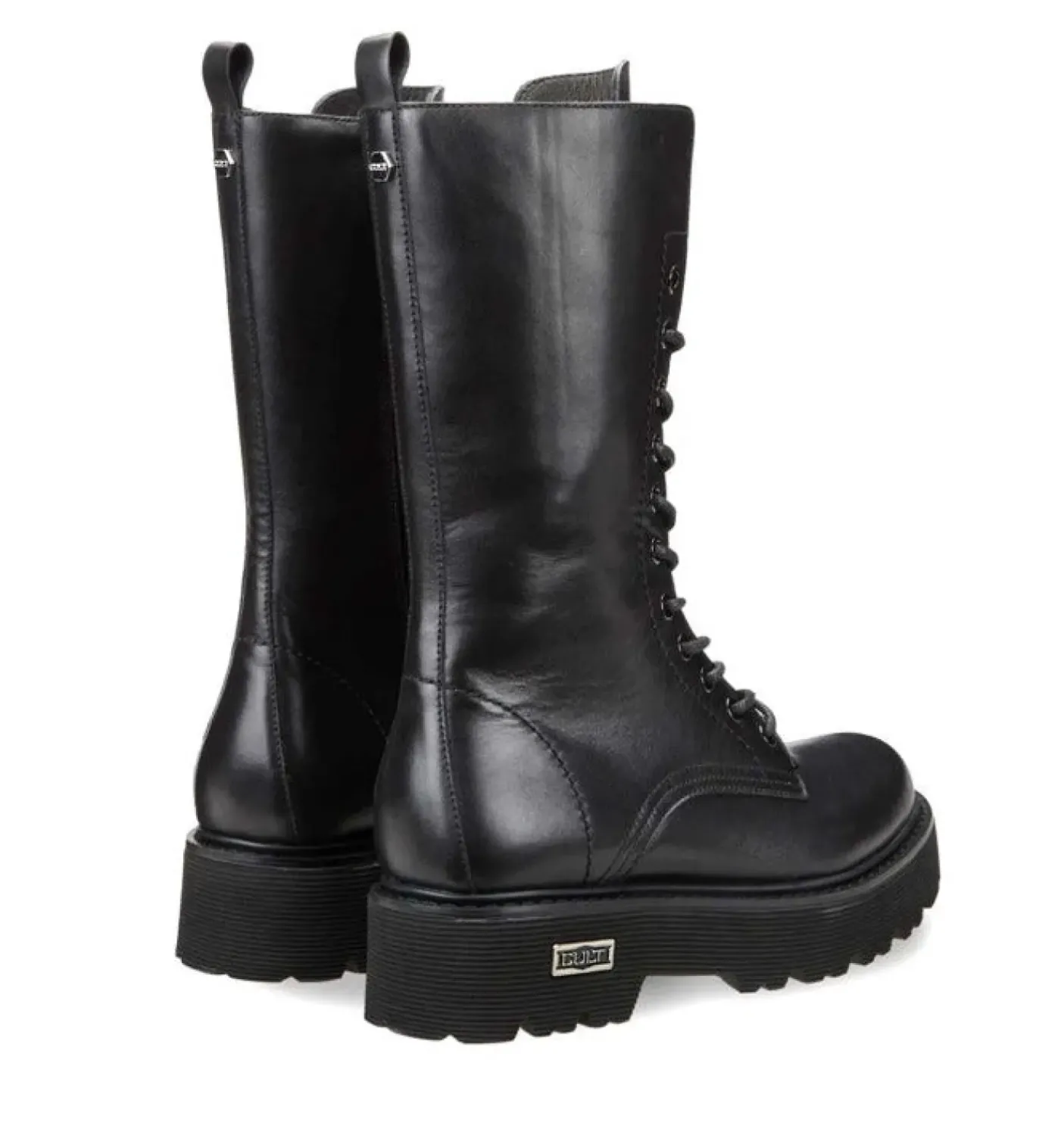 Anfibi In pelle nera, con chiusura tramite stringhe su occhielli tono su tono. Targhetta con logo sulla suola di gomma e tirante posteriore. Chiusura con zip e lacci. Fondo gomma 4cm.