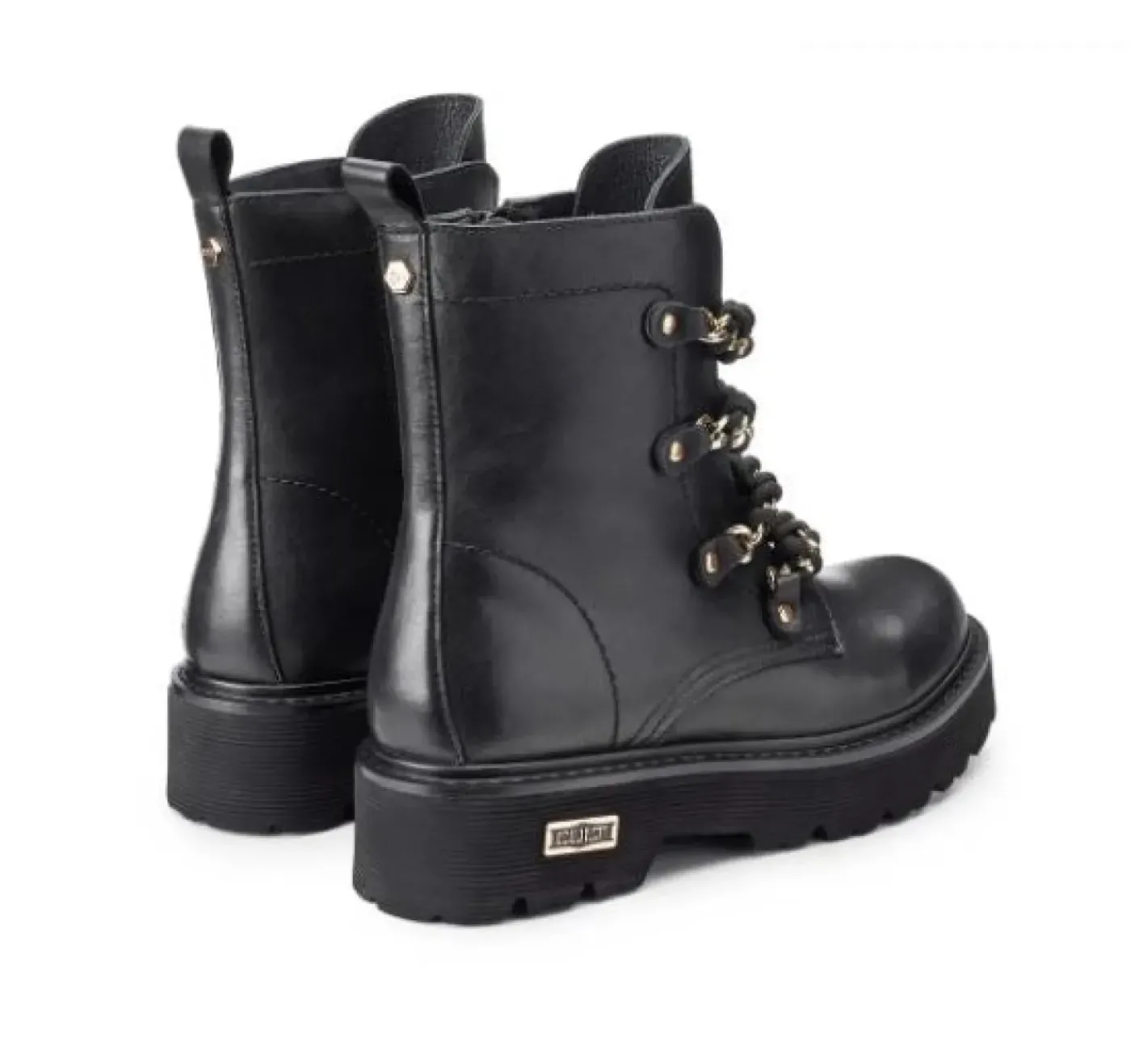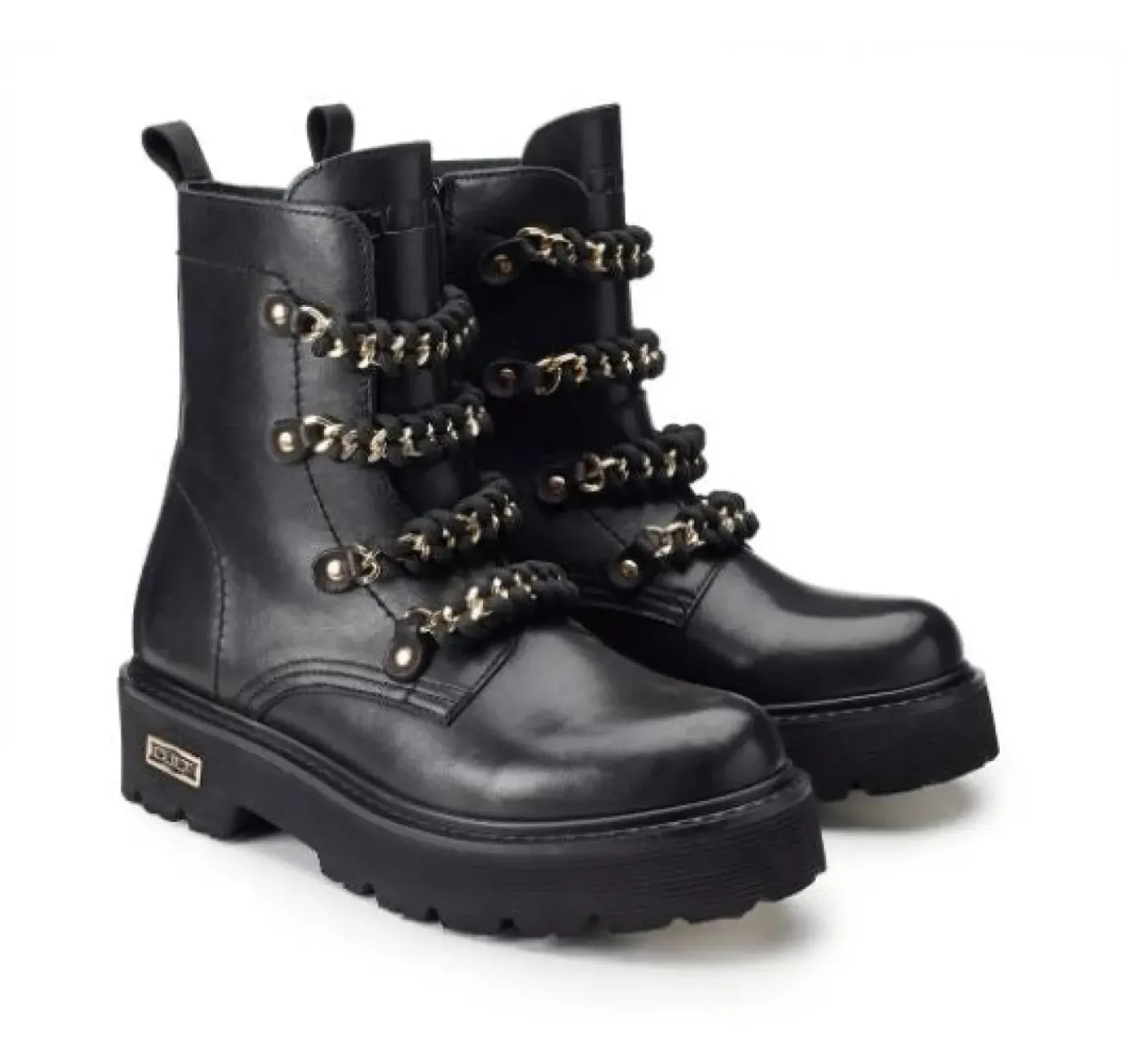 Anfibio in vera pelle con applicazioni catena gold e cotone nero. Chiusura con zip laterale. Suola in gomma 4cm, logo sul laterale gomma.