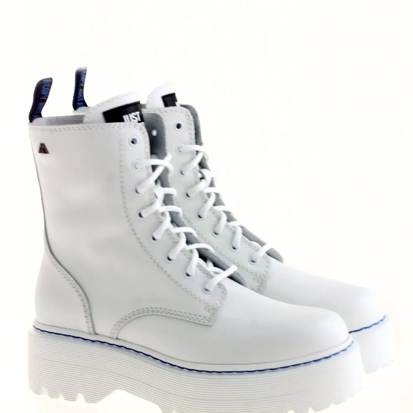 Anfibio in pelle ad 8 occhielli, cuciture sul fondo blu. Chiusura con lacci. Fondo gomma.