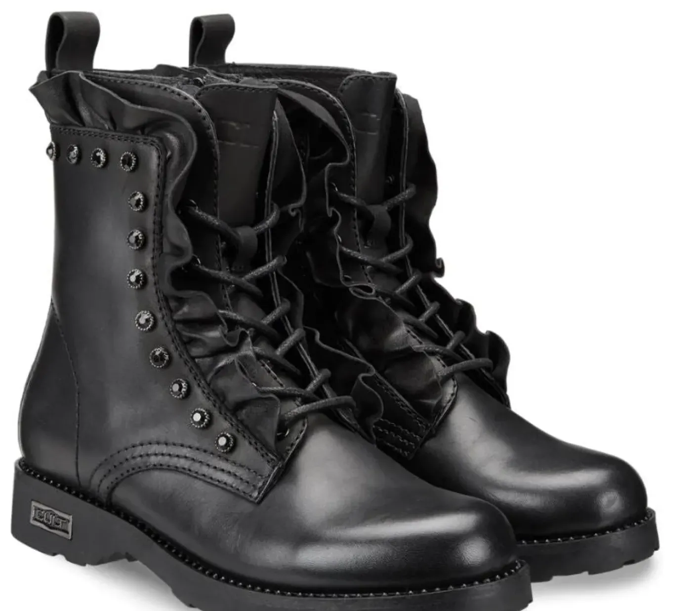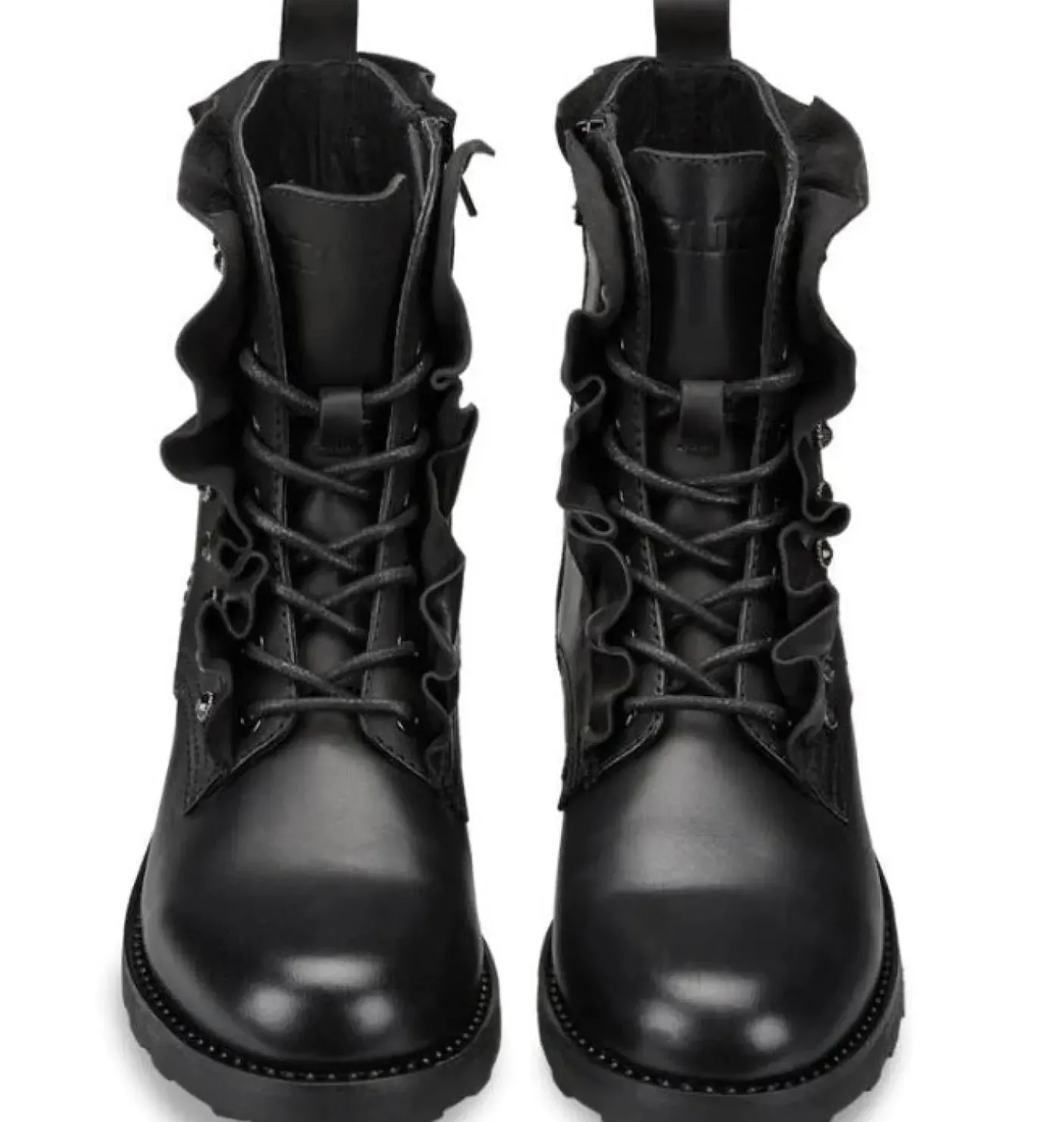 Anfibi in vera pelle con occhielli in metallo, impreziositi da ruches e mini borchie. linguetta posteriore. Fondo gomma.