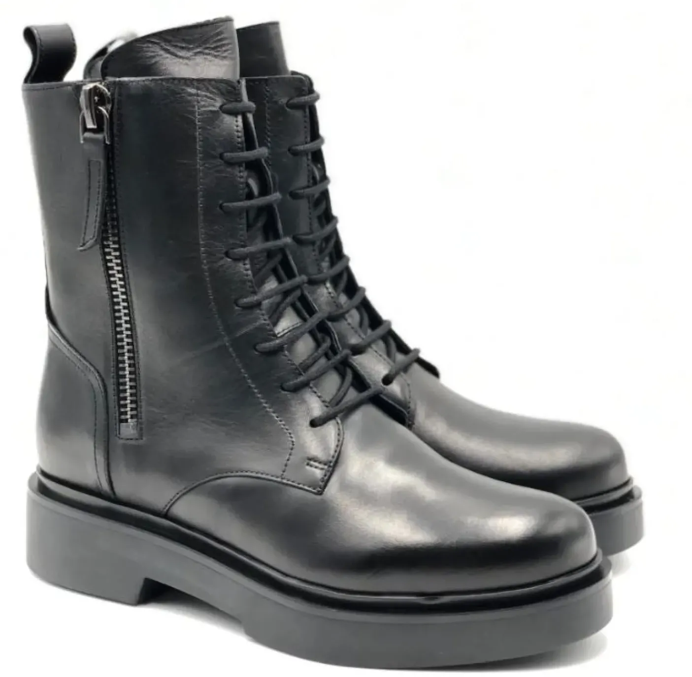 Anfibi in pelle, rivestito internamente in pelle. Chiusura con lacci e zip laterale. Dettagli zip decorativa. Fondo gomma 4cm