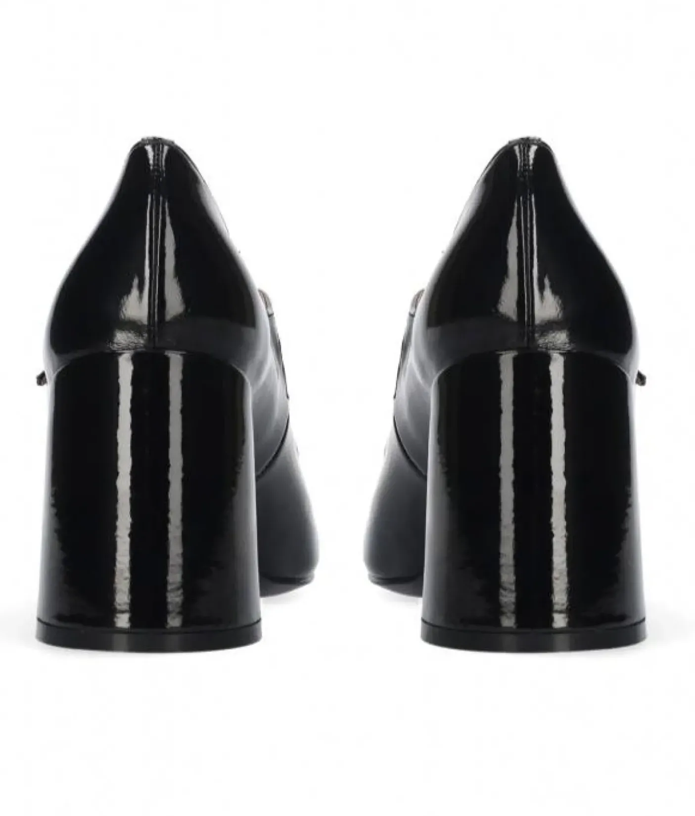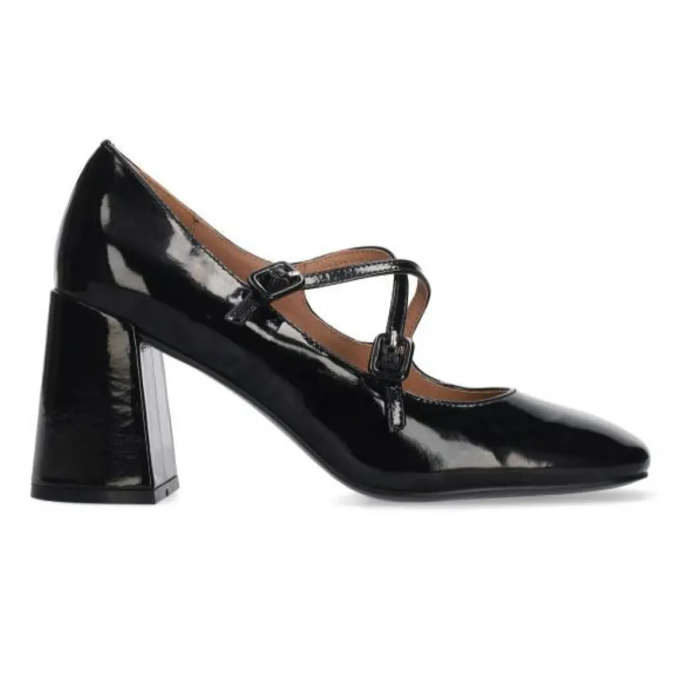 Ballerina in pelle lucida, rivestiti internamente in pelle. Chiusura con doppio cinturino incrociato regolabile. Tacco 8cm.