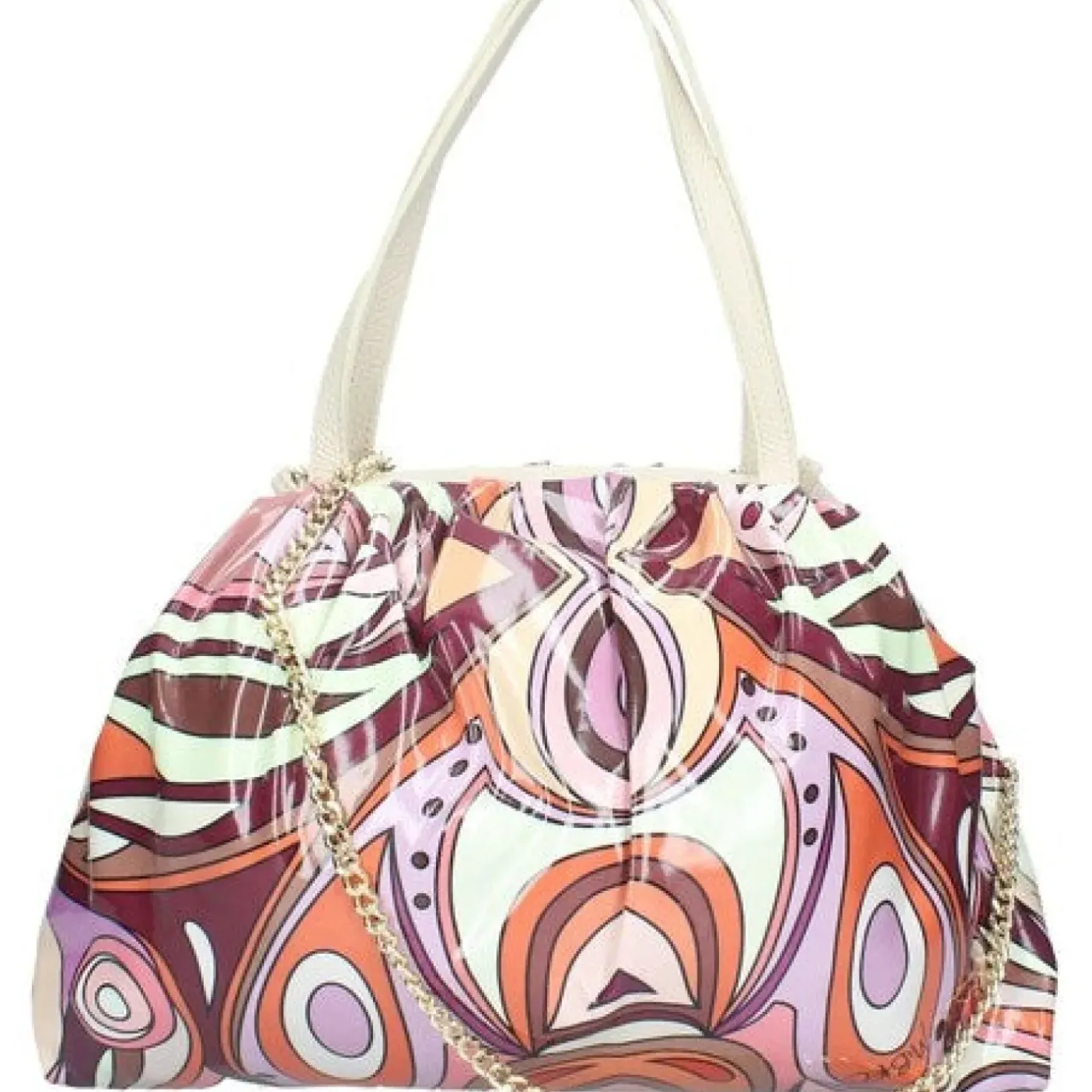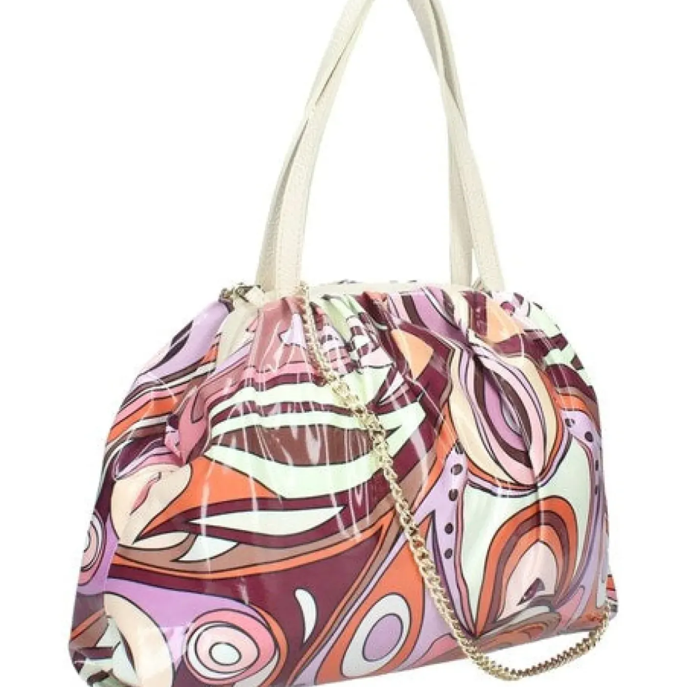 Borsa in pelle lucida multicolor, con manici in pelle e tracolla amovibile in catena color oro. Chiusura magnetica, interno con fodera e con una tasca con zip Esterno a fantasia