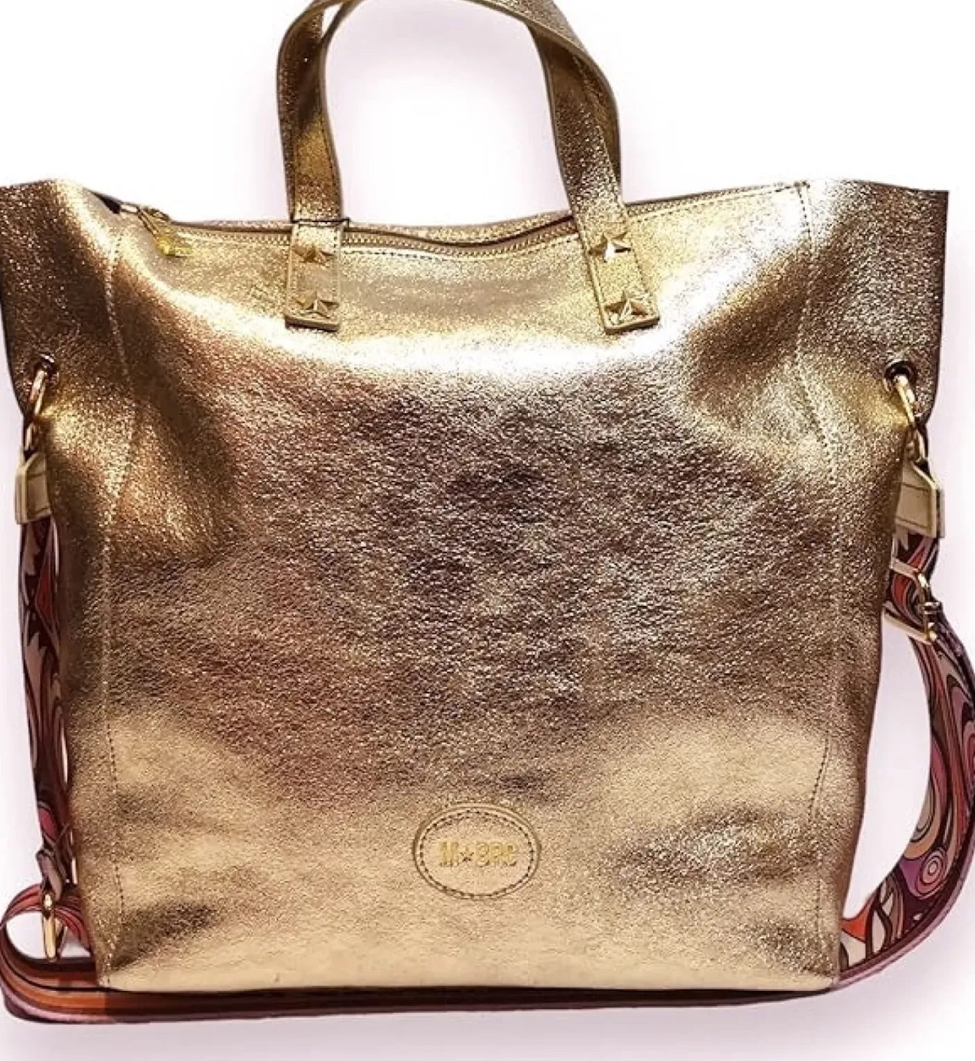 Borse a spalla in vera pelle con applicazioni metalliche stella. Chiusura con zip. Manici in pelle e tracolla in tessuto. Rivestita internamente e tasca portaoggetti con zip. Logo stampa frontale.