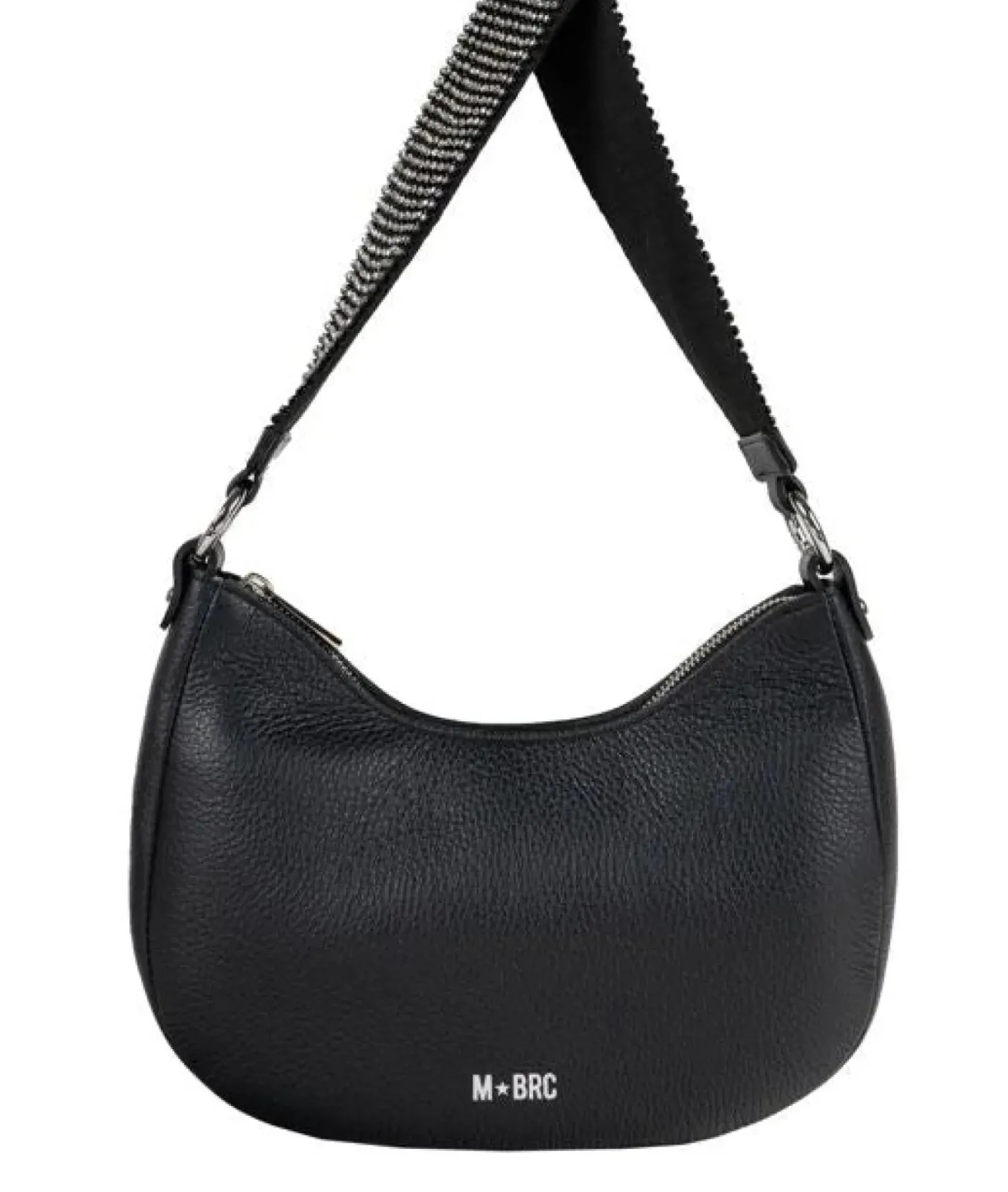 Borsa a spalla in vera pelle, tasca interna. forma ovale. Manico in pelle e manico con strass argento. Logo frontale. Chiusura con zip.