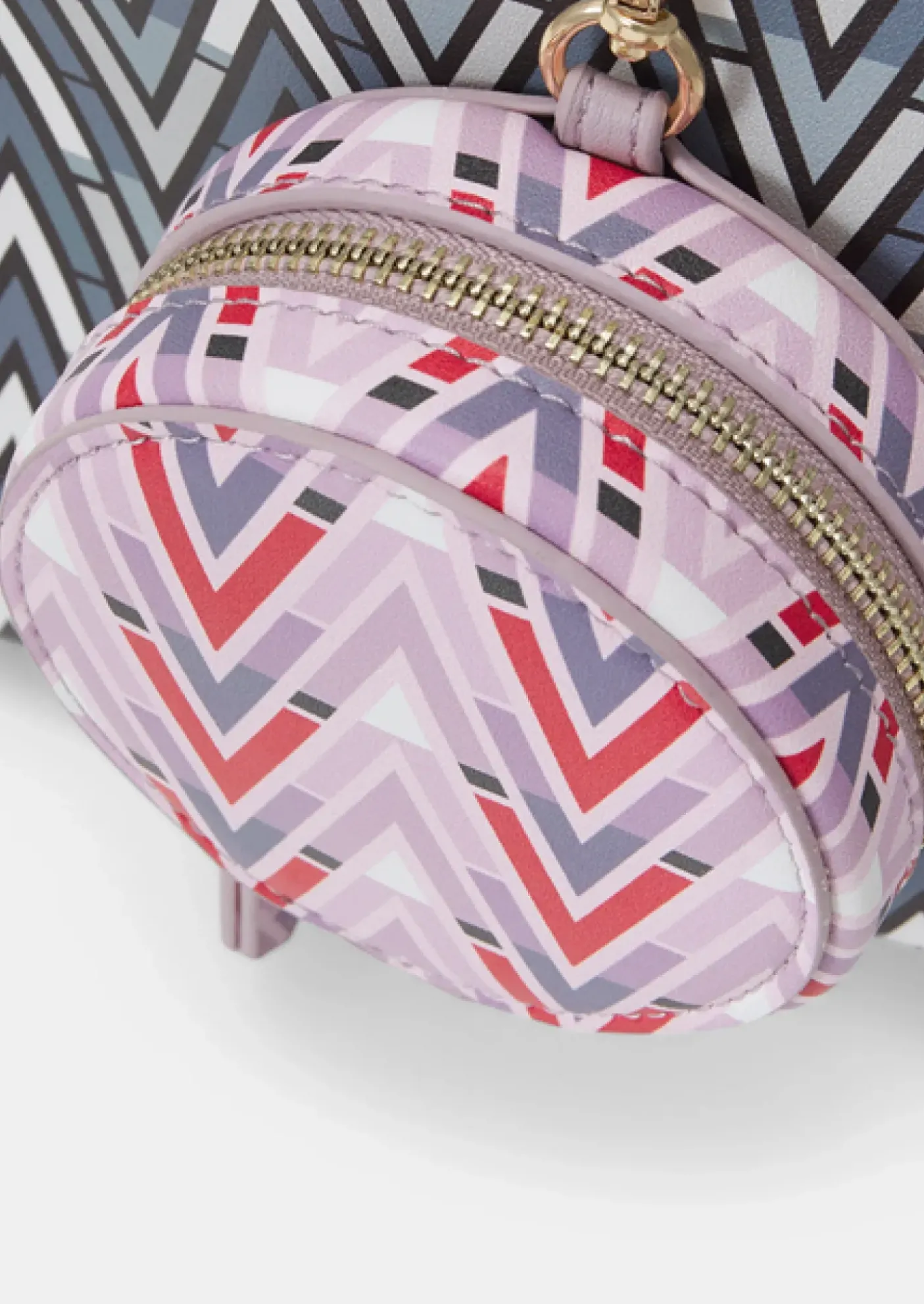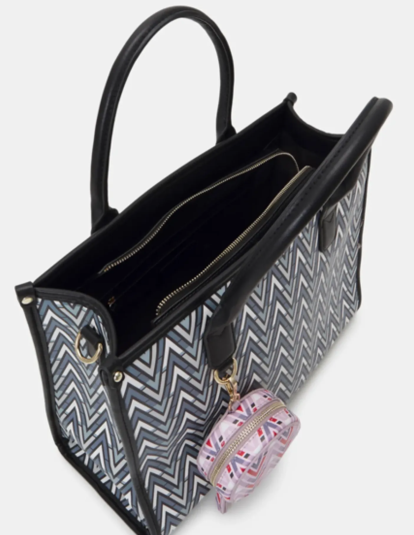 Borsa in ecopelle bordata ecopelle nera con stampa geometrica bianco, celeste e blu. Due manici tubolari, chiusura con zip. Borsellino a contrasto asportabile. Tracolla regolabile. tasca interna con zip