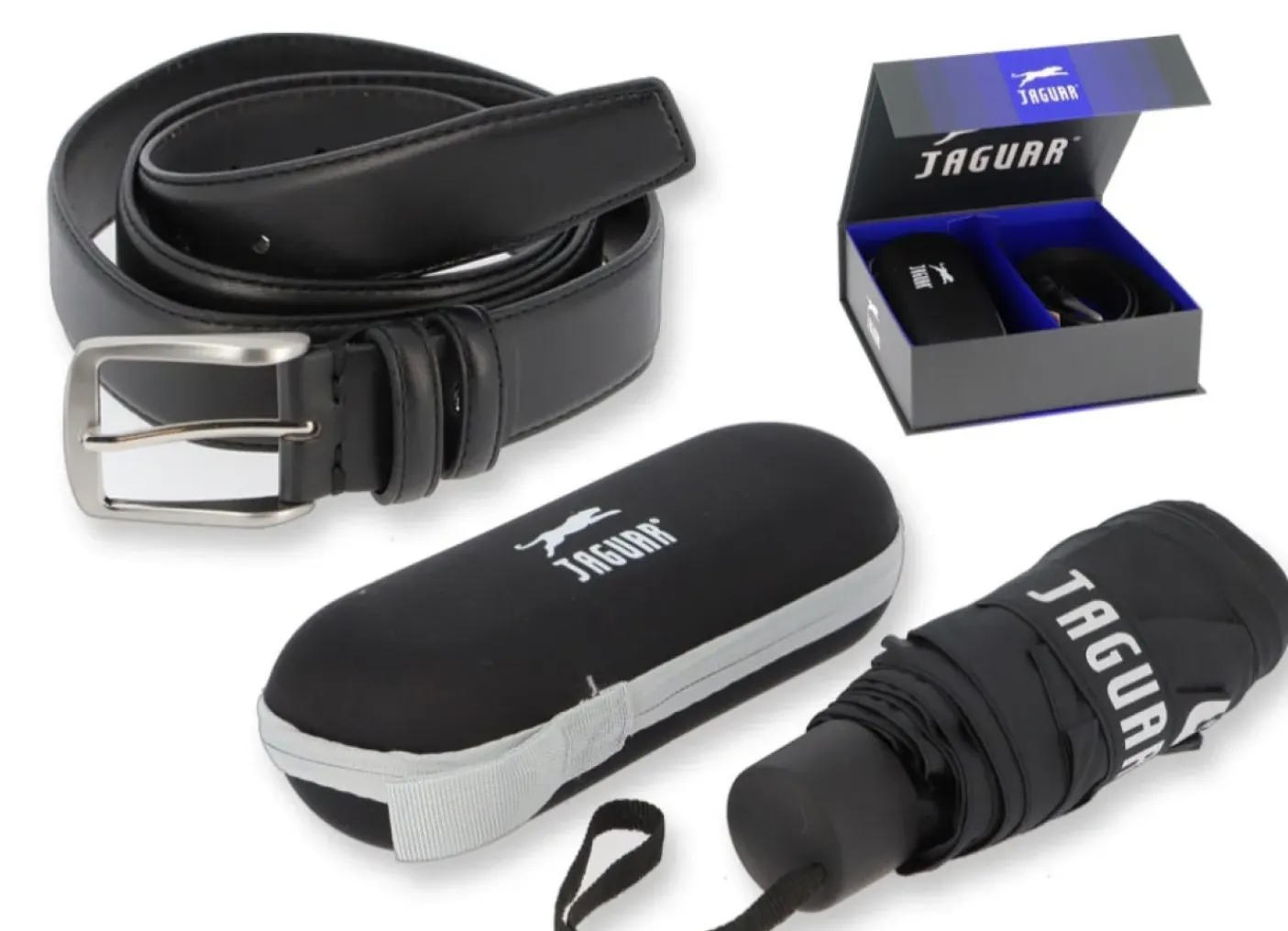 Cofanetto con cintura in ecopelle e fibbia logata e ombrello a scatto con custodia semirigida lodata zip.
