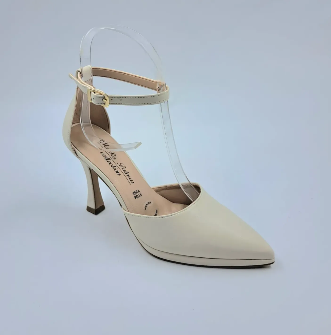 Decollete in ecopelle con cinturino regolabile alla caviglia. Rivestita internamente in pelle. Soletta in vera pelle e leggero memory form. Tacco a rocchetto 9.5 cm, plateau 1cm.