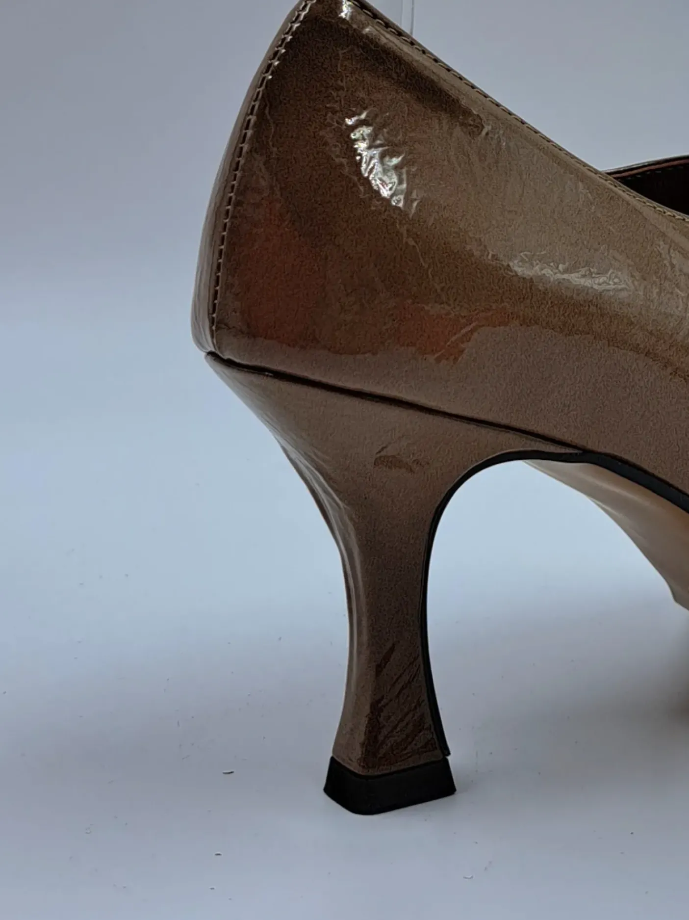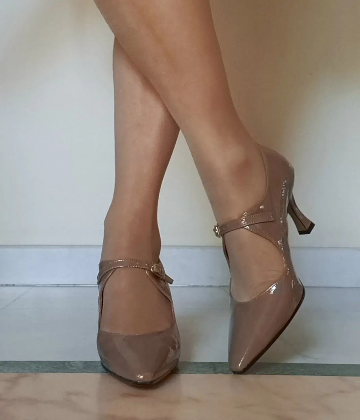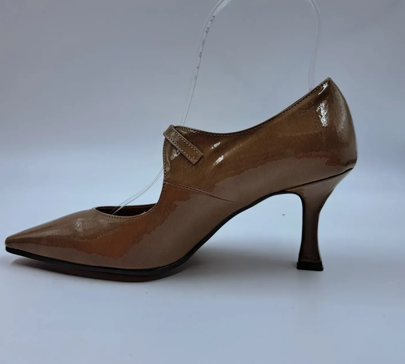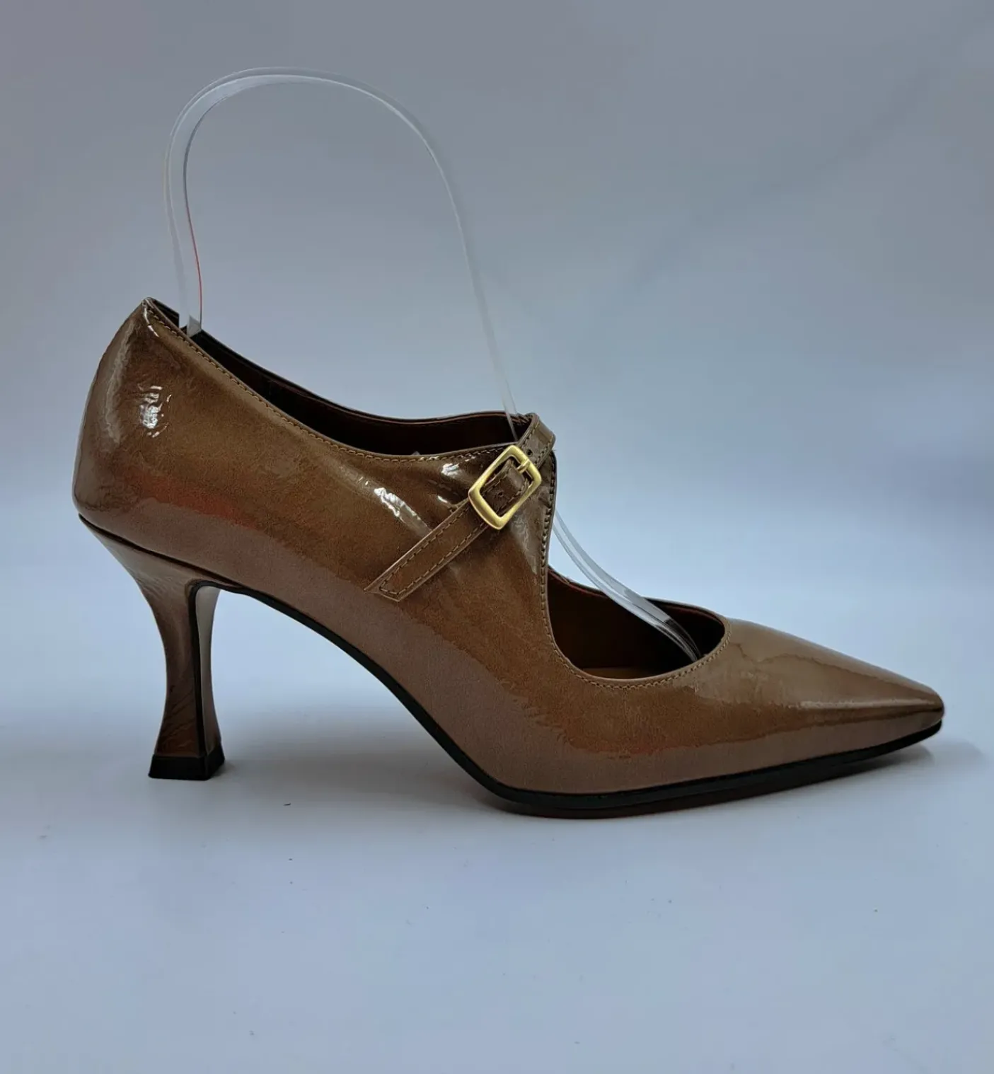 Decolletè in ecopelle lucida morbida, rivestita internamente in pelle. Fibbia sul collo piede regolabile. Soletta in pelle leggermente morbida. Tacco 7cm