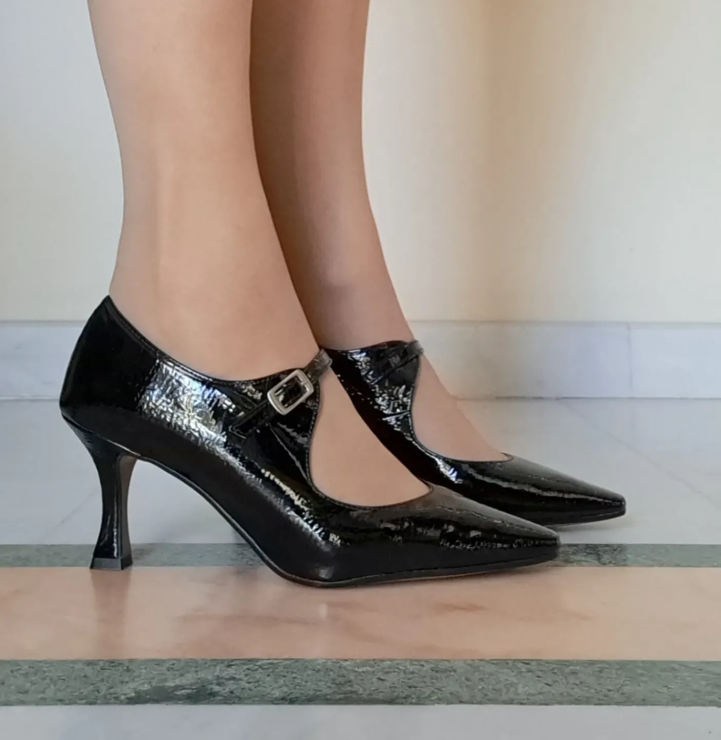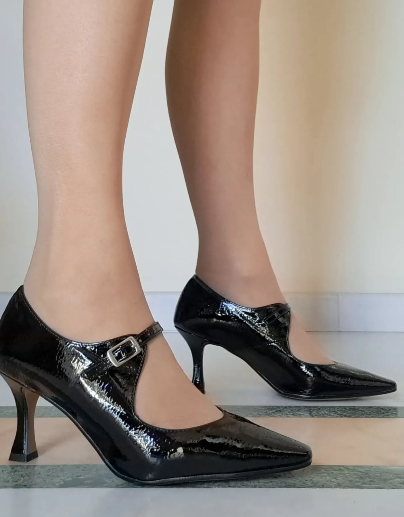Decolletè in ecopelle lucida morbida, rivestita internamente in pelle. Fibbia sul collo piede regolabile. Soletta in pelle leggermente morbida. Tacco 7cm