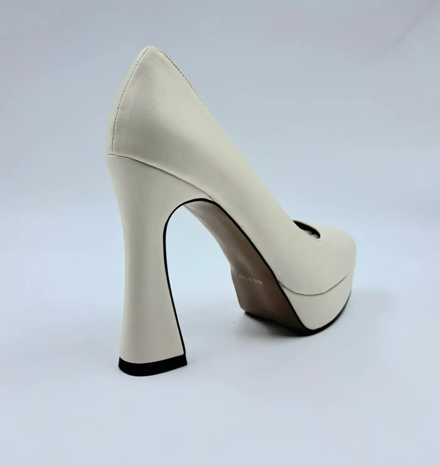 Decolleté in ecopelle rivestita internamente in pelle. Punta affusolata. Tacco squadrato 11.5 cm e plateau 2.5cm