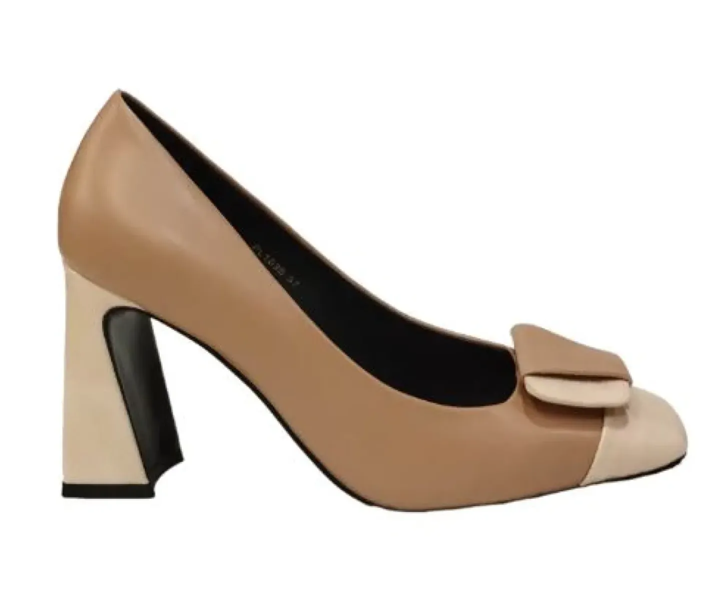 Decolleté in vera pelle con punta smussata e tacco a contrasto. Rivestita internamente in pelle. Tacco a squadrato 9cm