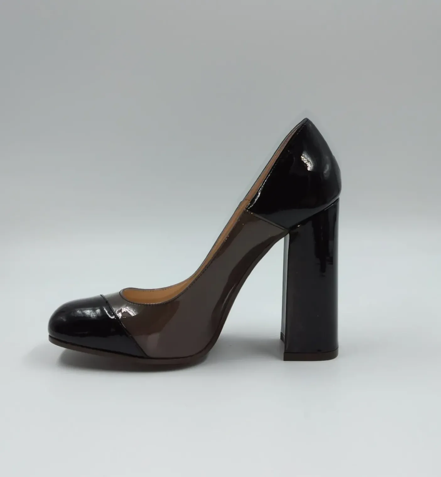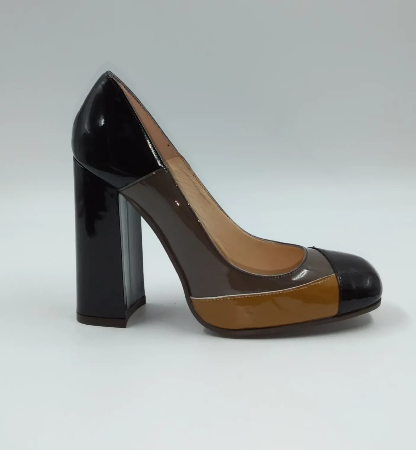 Scarpa decolleté in Vernice vera pelle in tre colori. Tutta rivestita internamente di pelle. Tacco quadrato rivestito in pelle 10 cm. Comoda e mordida con calzabilità regolare.