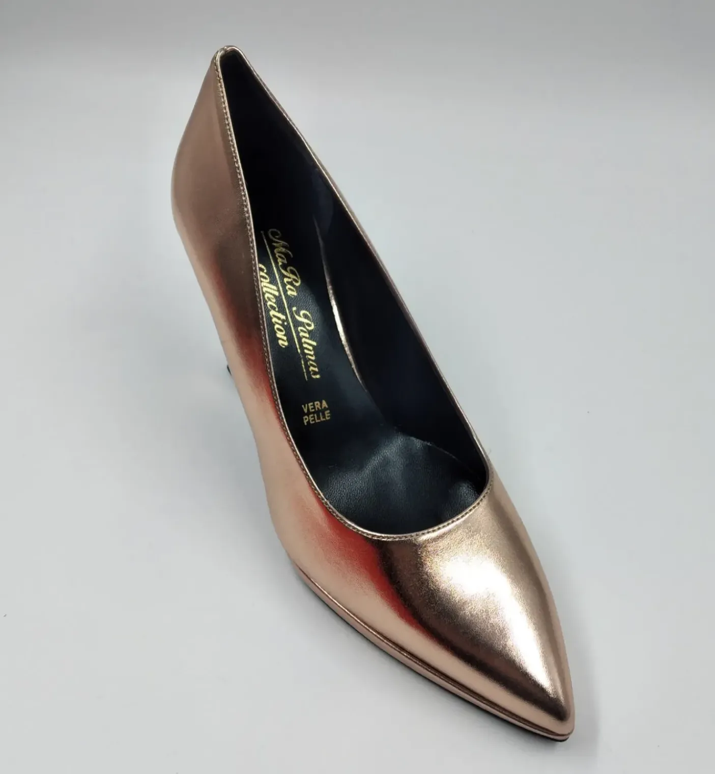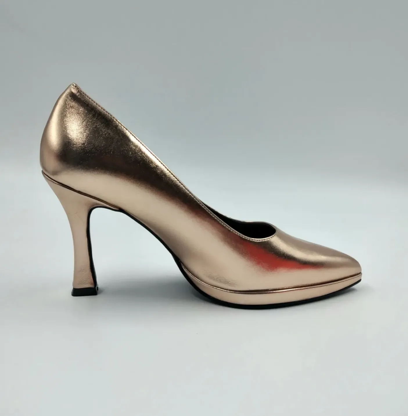 Decollete morbida rivestita internamente in Vera Pelle. Soletta in memory foarm. Tacco a rocchetto 10 cm e plateau 1cm.