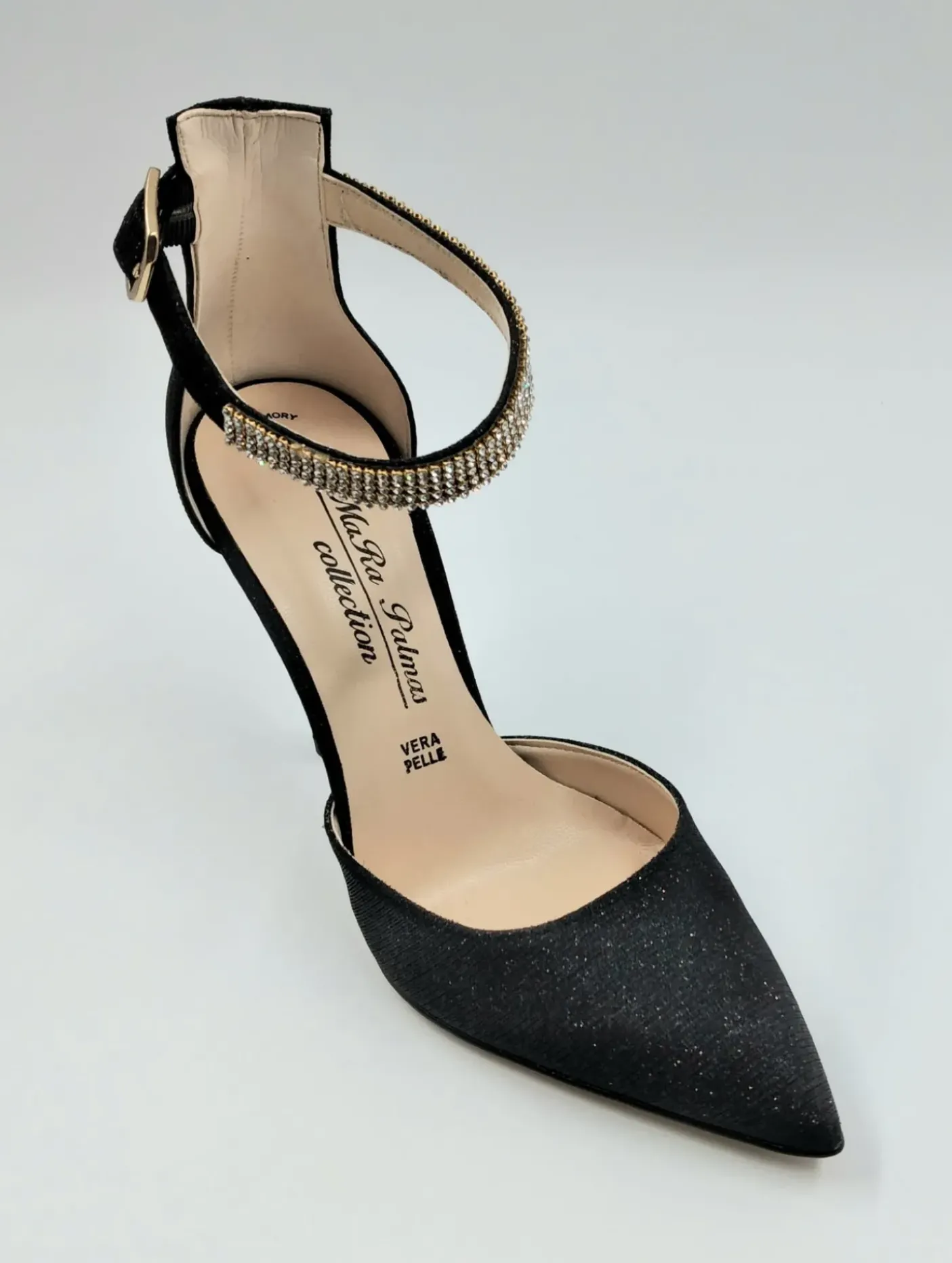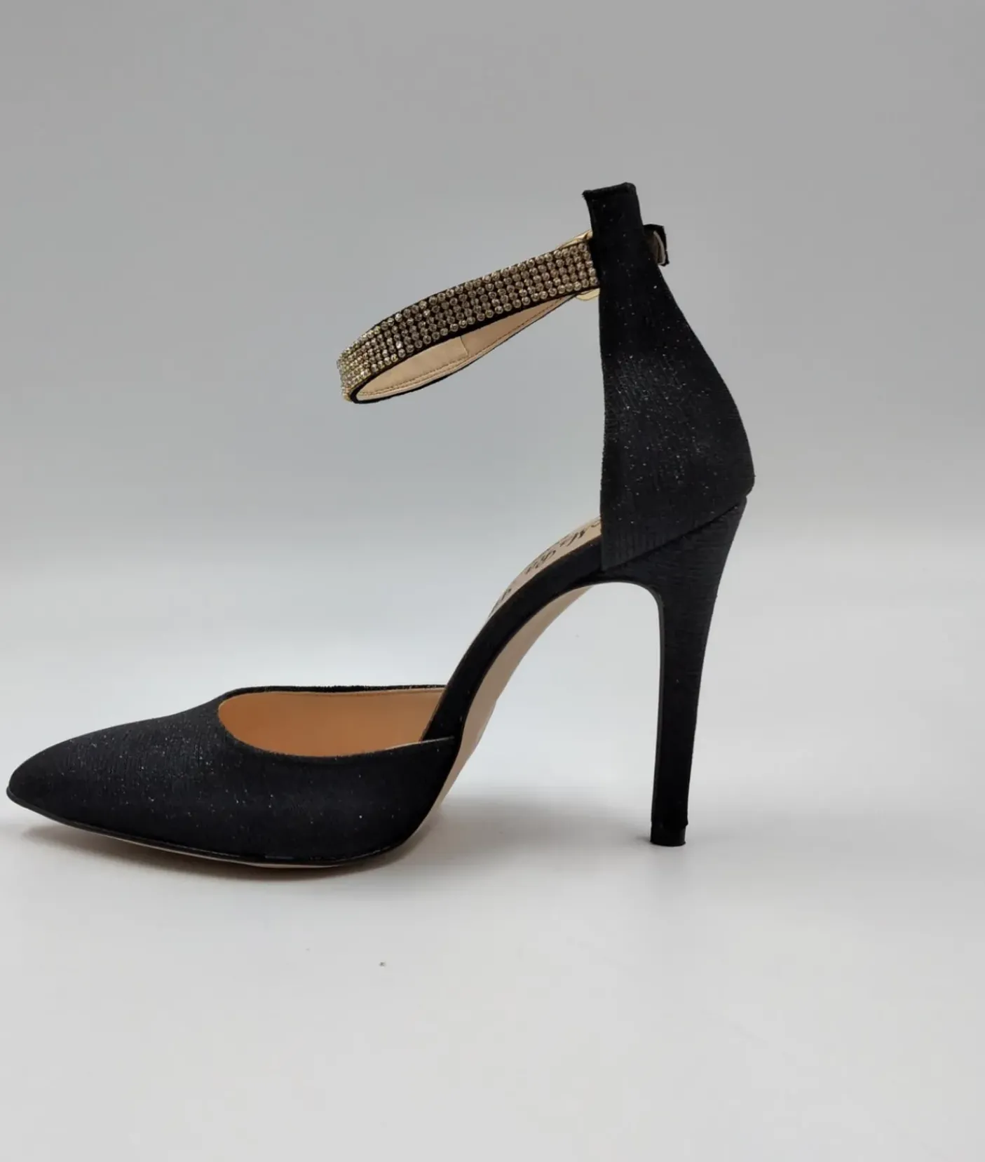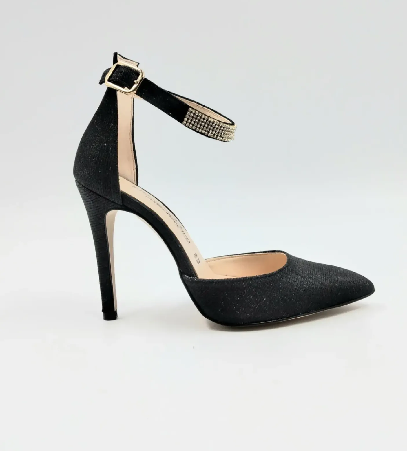 Decollete in stoffa lux con cinturino alla caviglia decorato con fascia strass regolabile. Foderato internamente in pelle. Tacco 10cm.