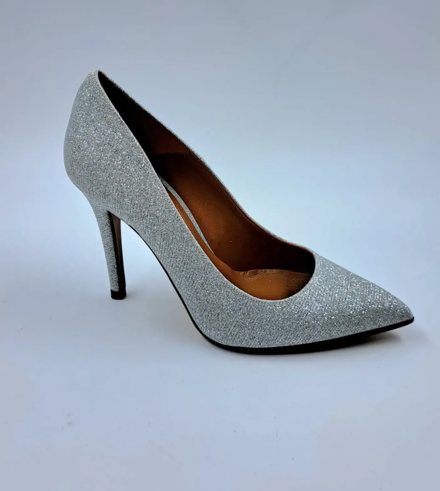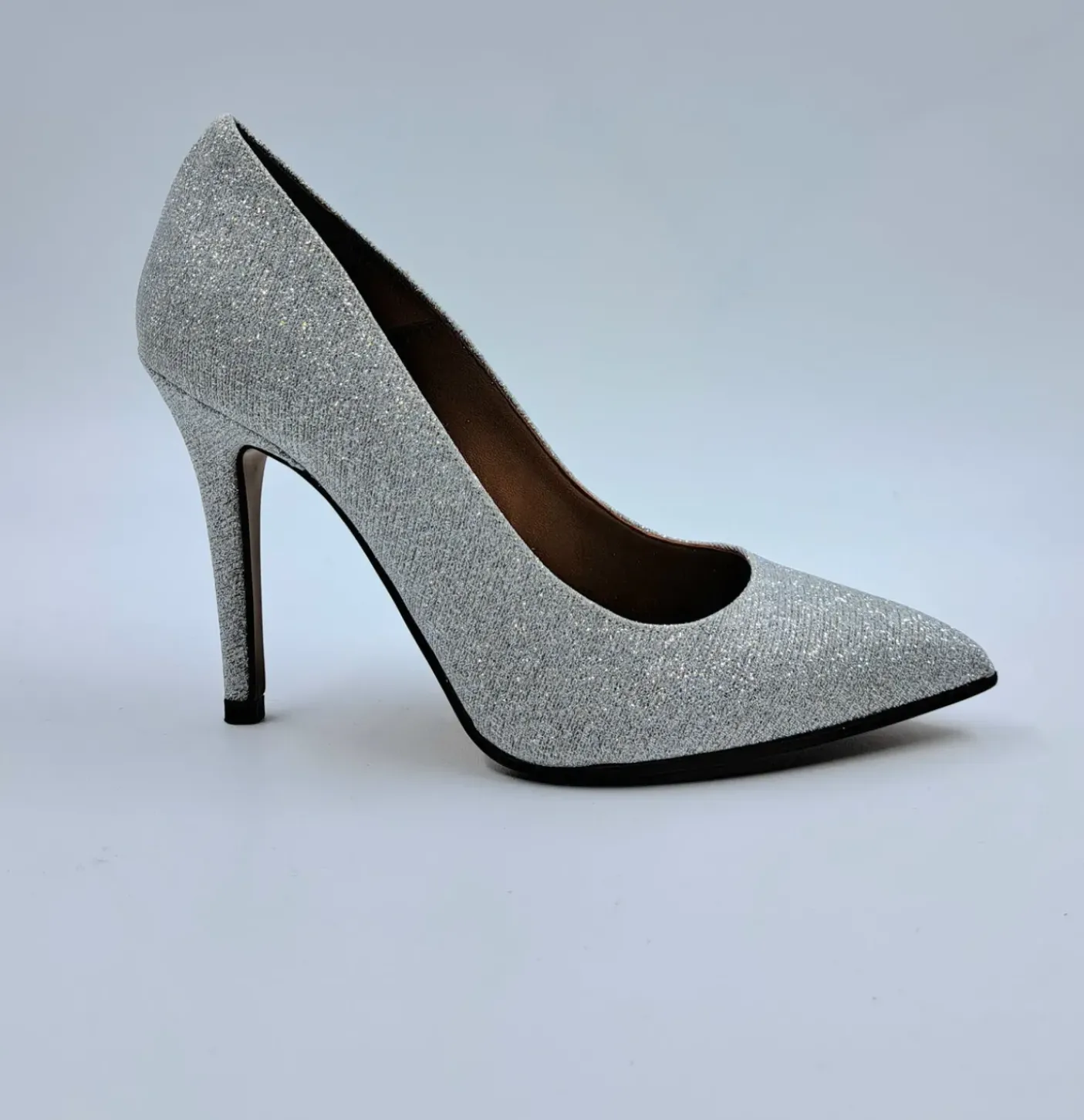 Decollete in tessuto rigato a rilievo argento. Interno rivestito in pelle. Soletta in pelle. Fondo gomma tacco 10cm