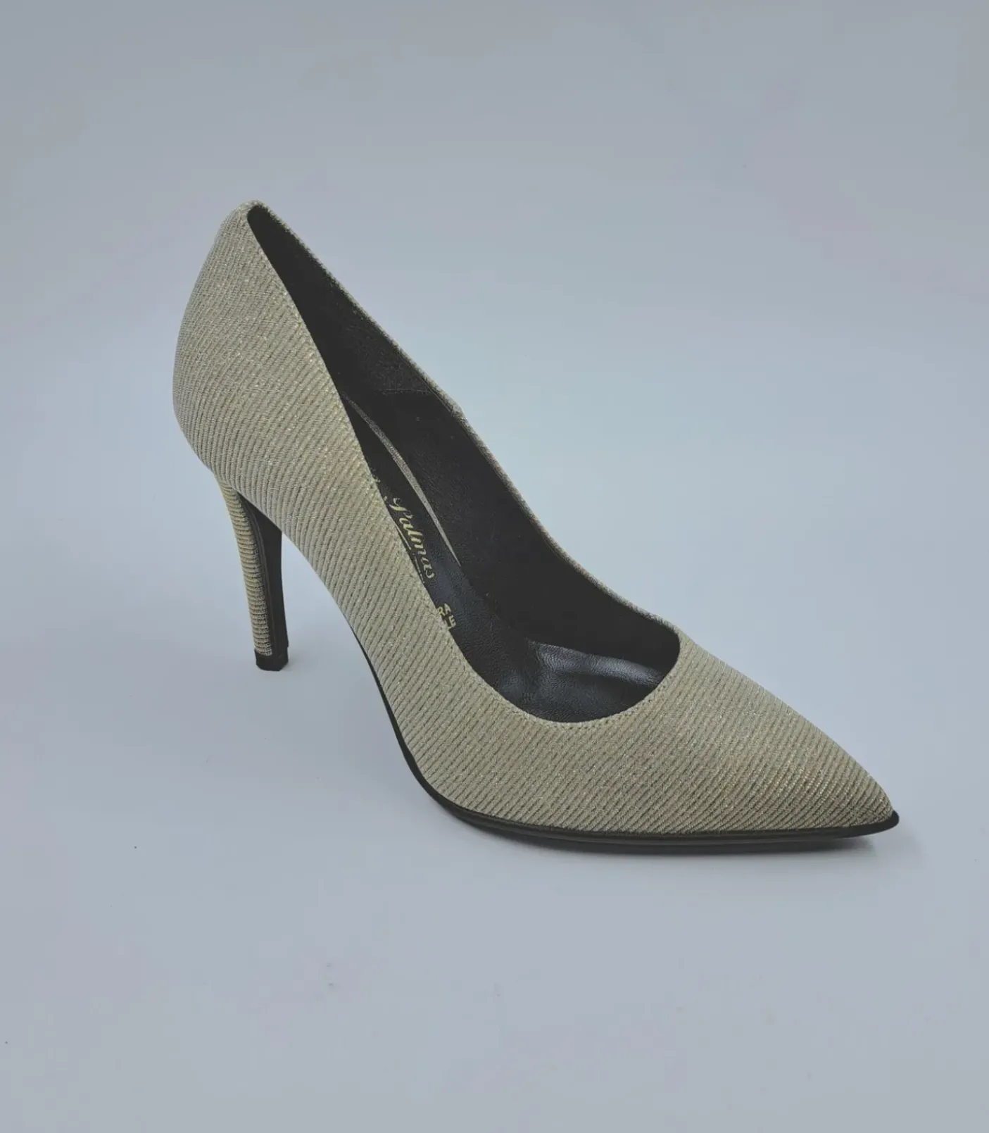 Decollete in tessuto rigato a rilievo platino. Interno rivestito in pelle. Soletta in pelle. Fondo gomma tacco 10cm