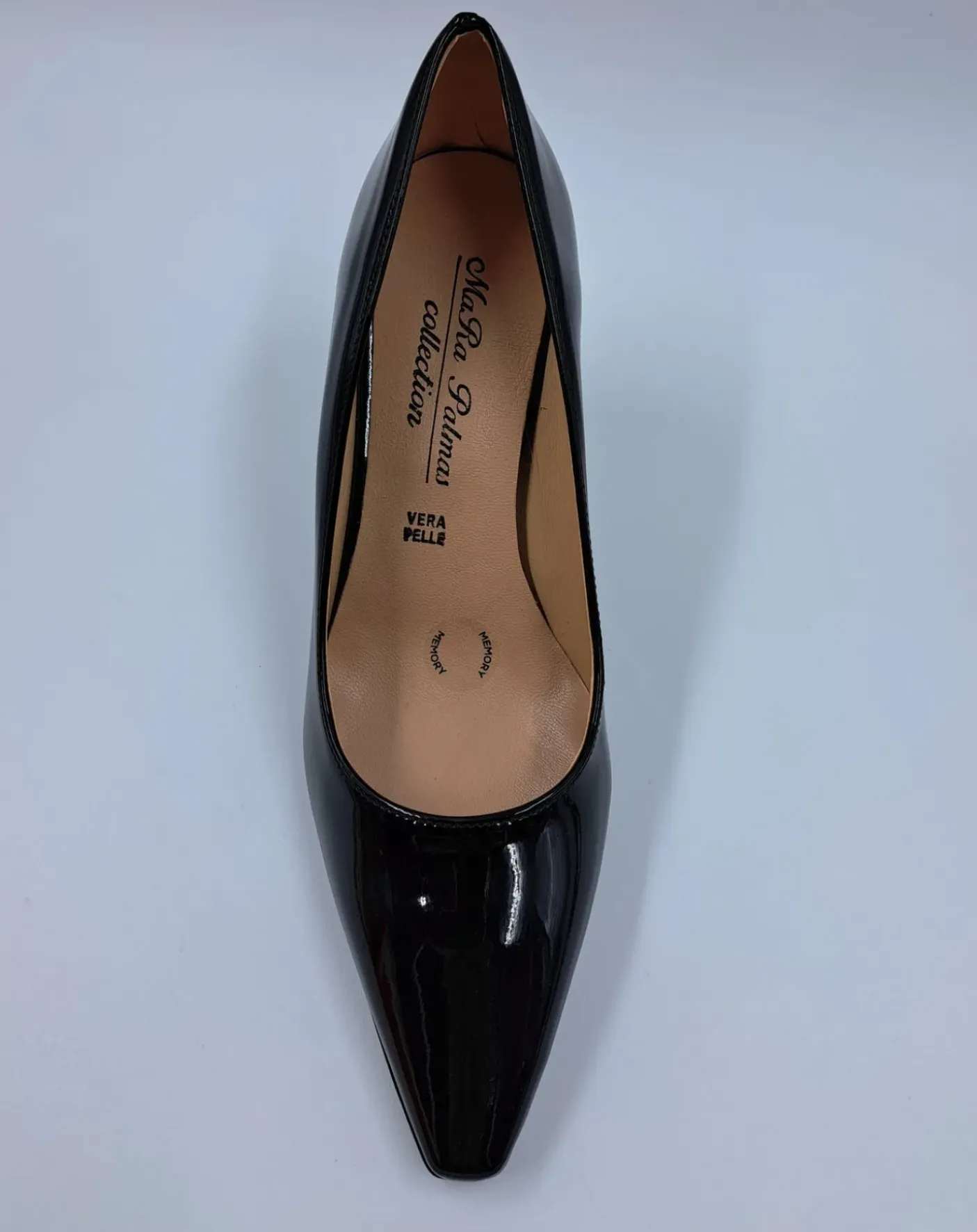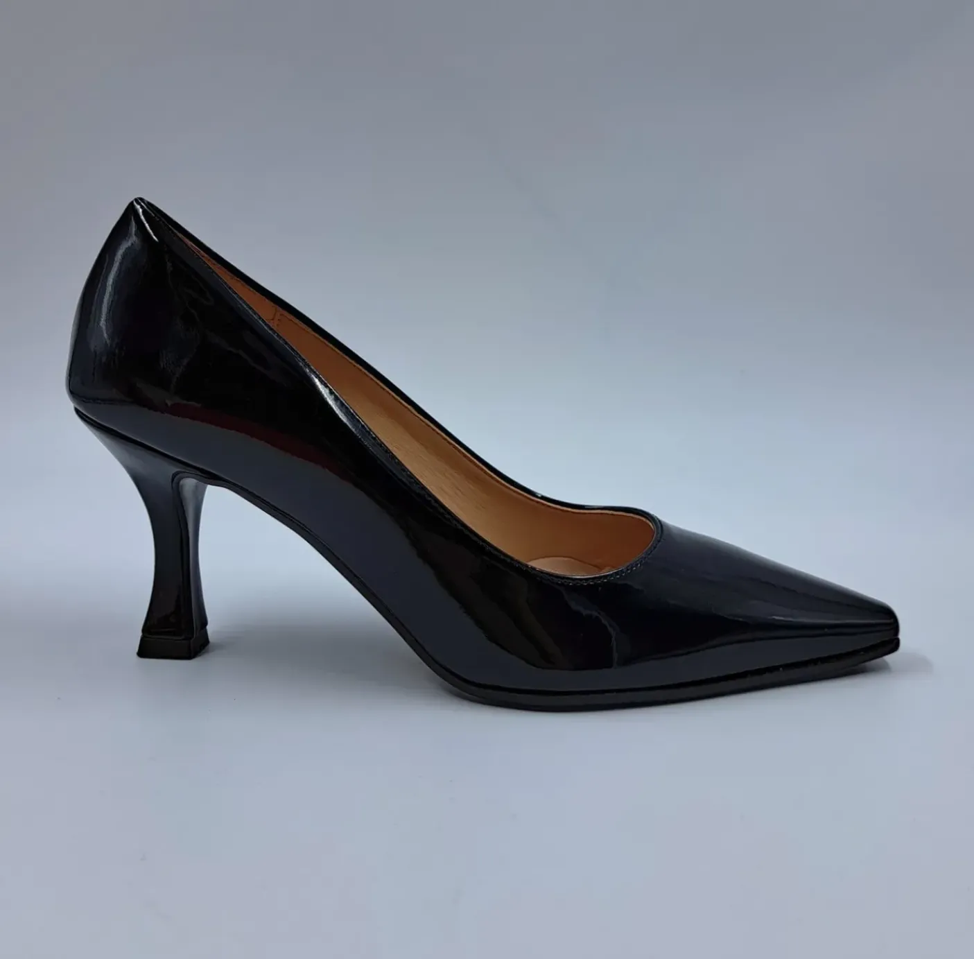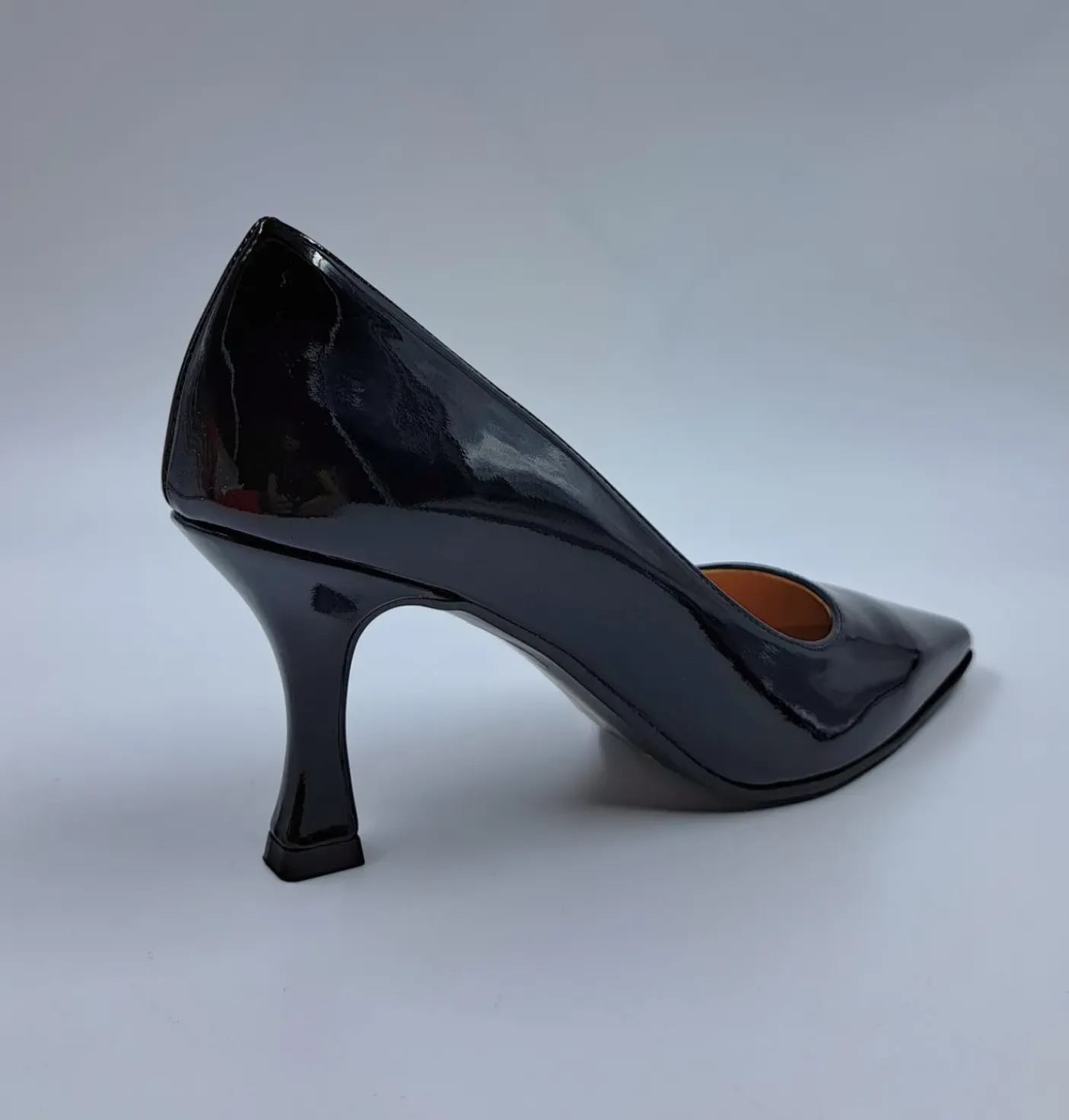 Decollete morbida ecopelle lucida, rivestita internamente in Vera Pelle. Soletta in pelle. Tacco a rocchetto 7 cm.