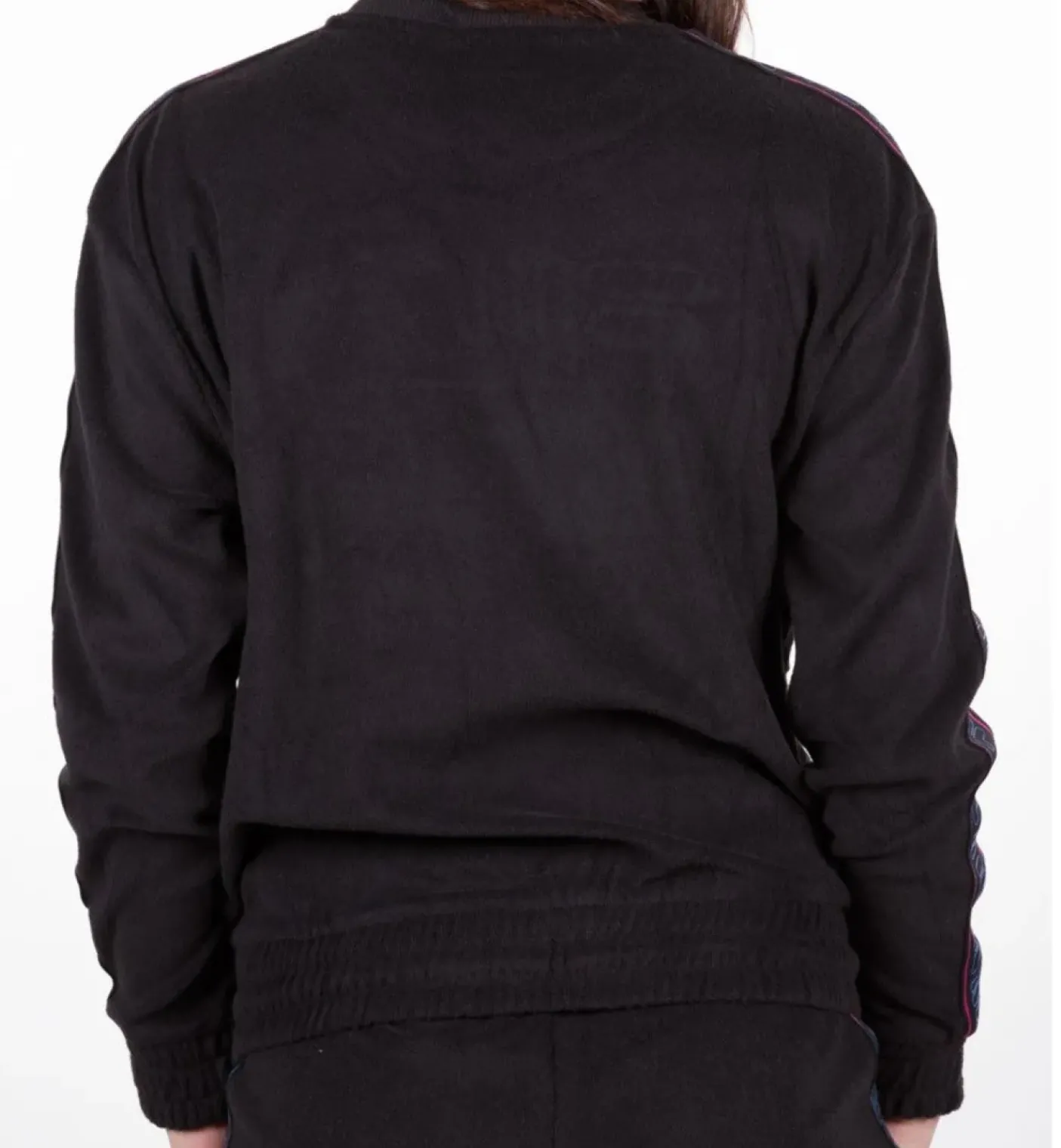 Felpa in cotone vellutato con maxi logo frontale. girocollo e polsini a costina. Elastico alla base con laccetto. Fasce logate colorate sulle maniche.