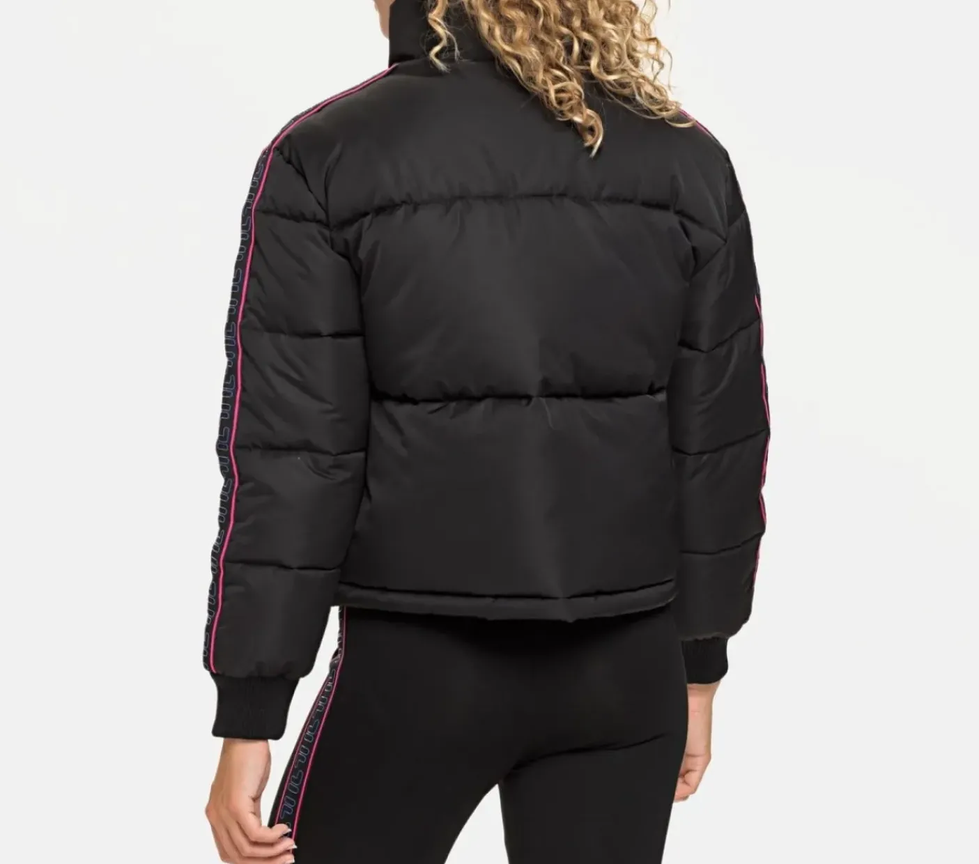 Piumino con collo alto e fasce logate sulle maniche. Tasche laterali e chiusura a zip.
