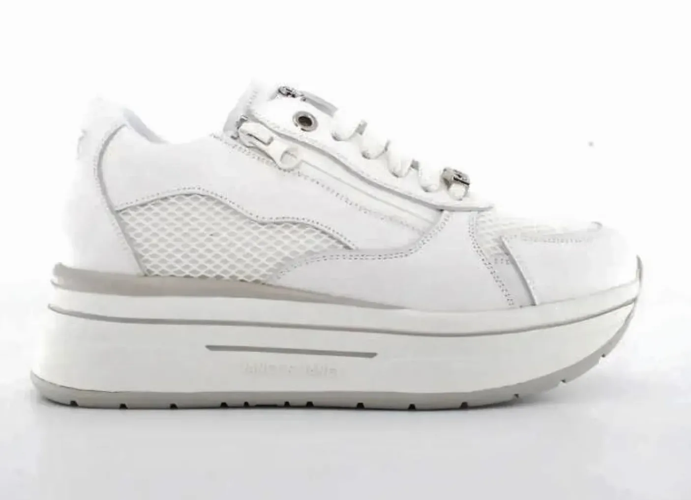 Sneakers in vera pelle e tessuto tecnico, rivestita internamente in pelle. Soletta in pelle estraibile. Chiusura con lacci e zip laterale. Fondo gomma 5cm