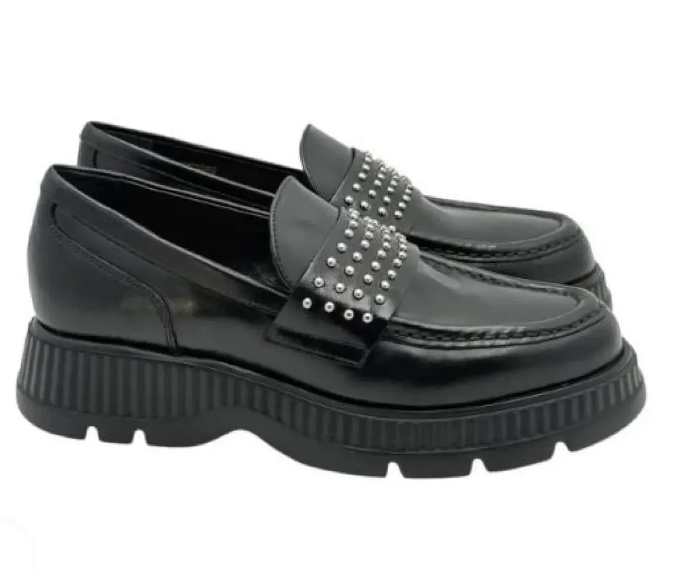 Mocassini in vera pelle morbida, decorazione fasce mini borchie. Rivestito internamente in pelle. Fondo in gomma 2 cm