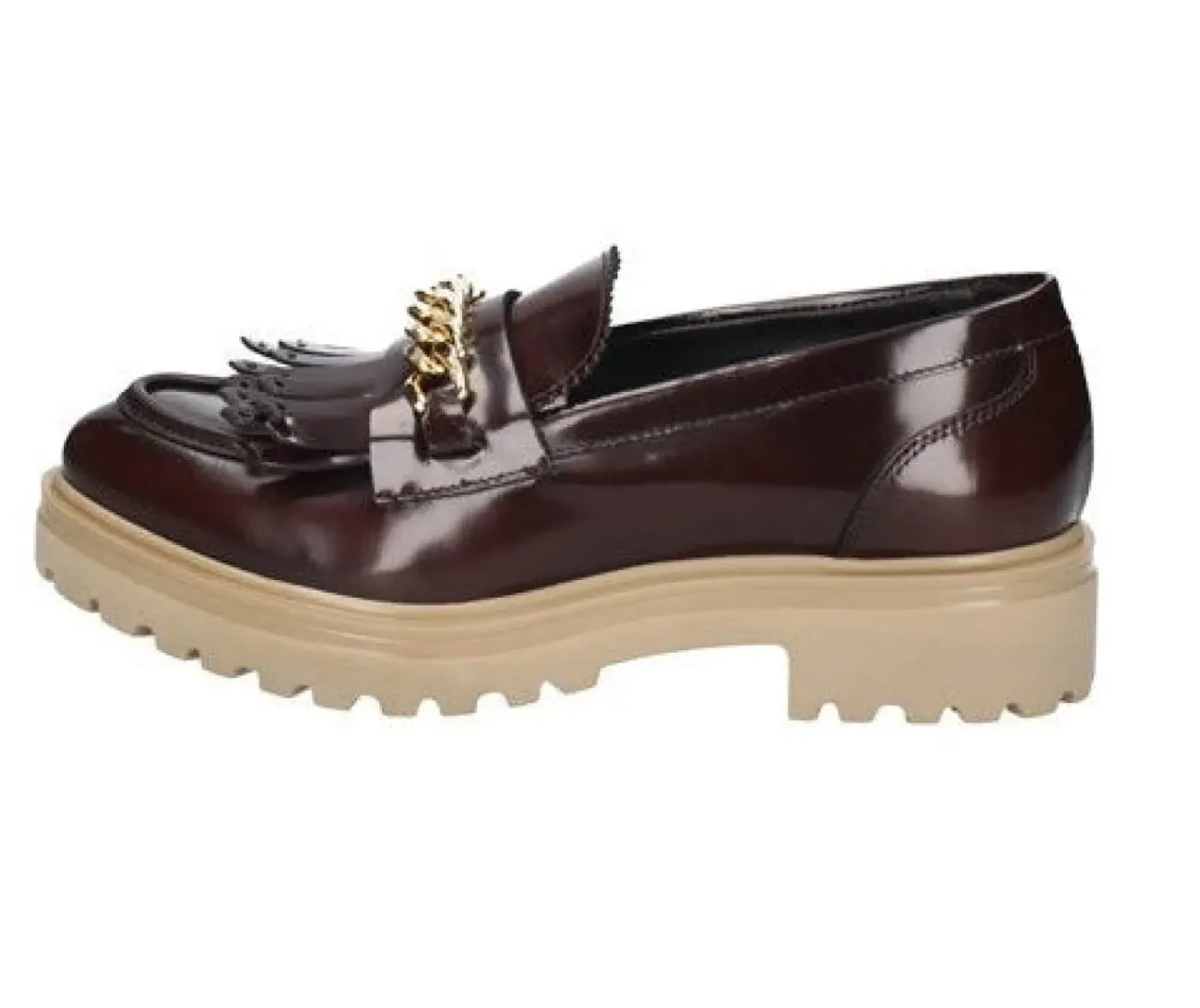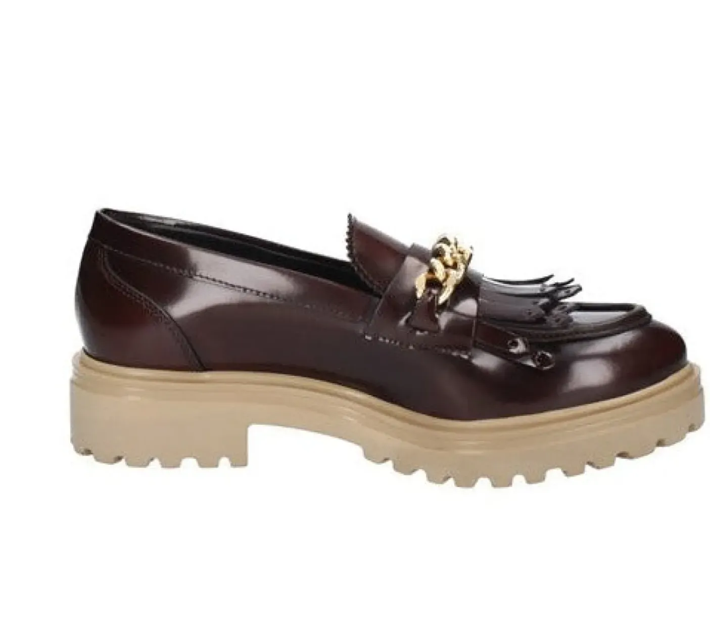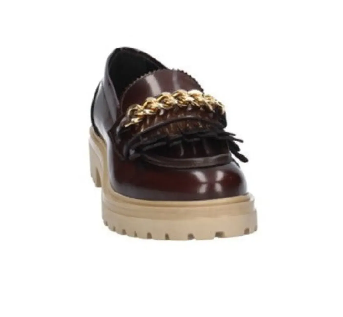Mocassini in pelle morbida lucida. Rivestita internamente in pelle. Applicazione catena oro e frange in pelle. Soletta in pelle. Fondo in gomma 4cm