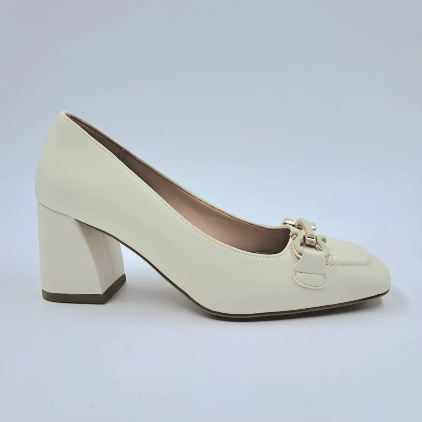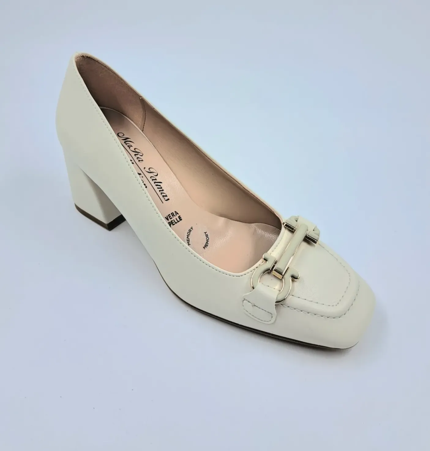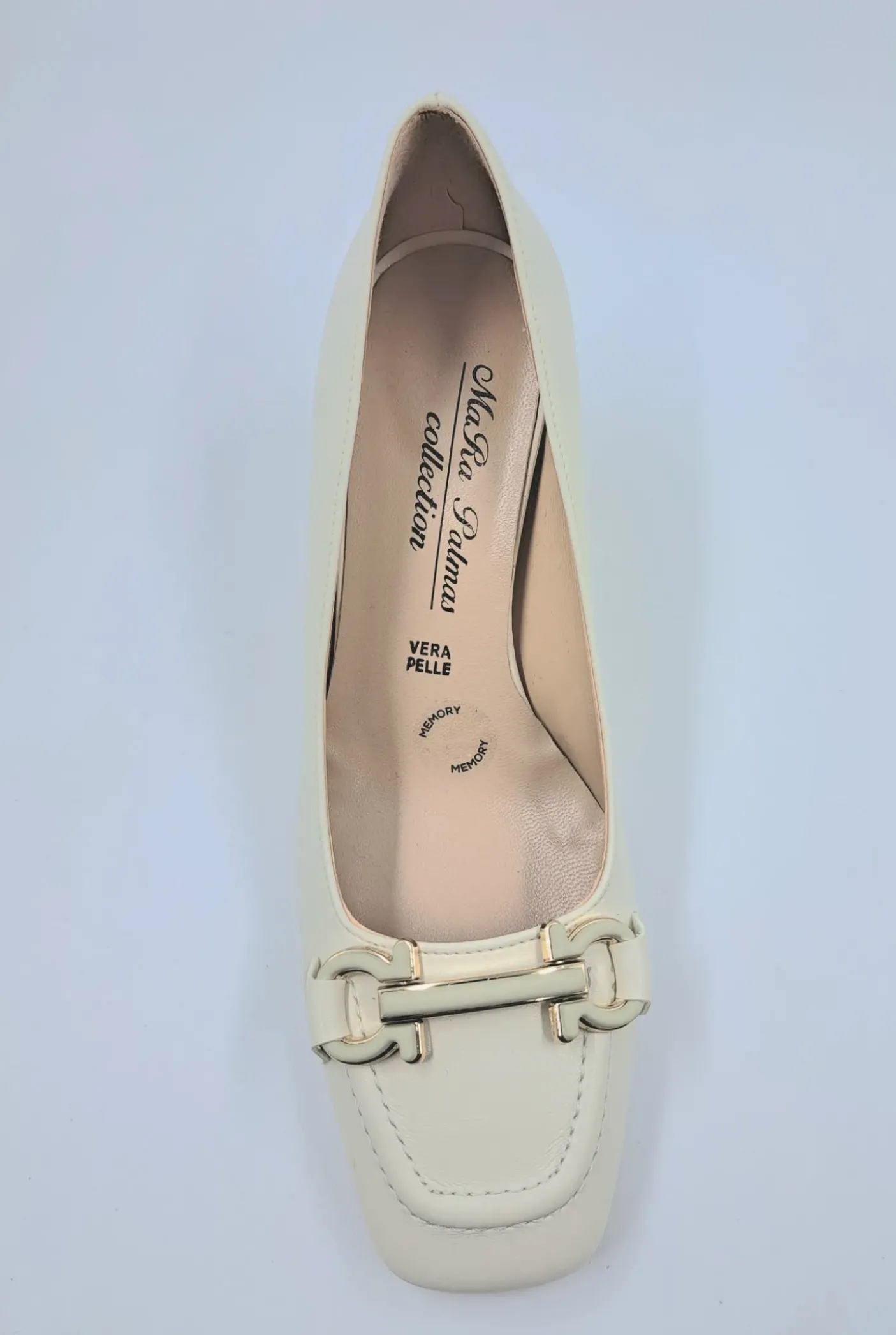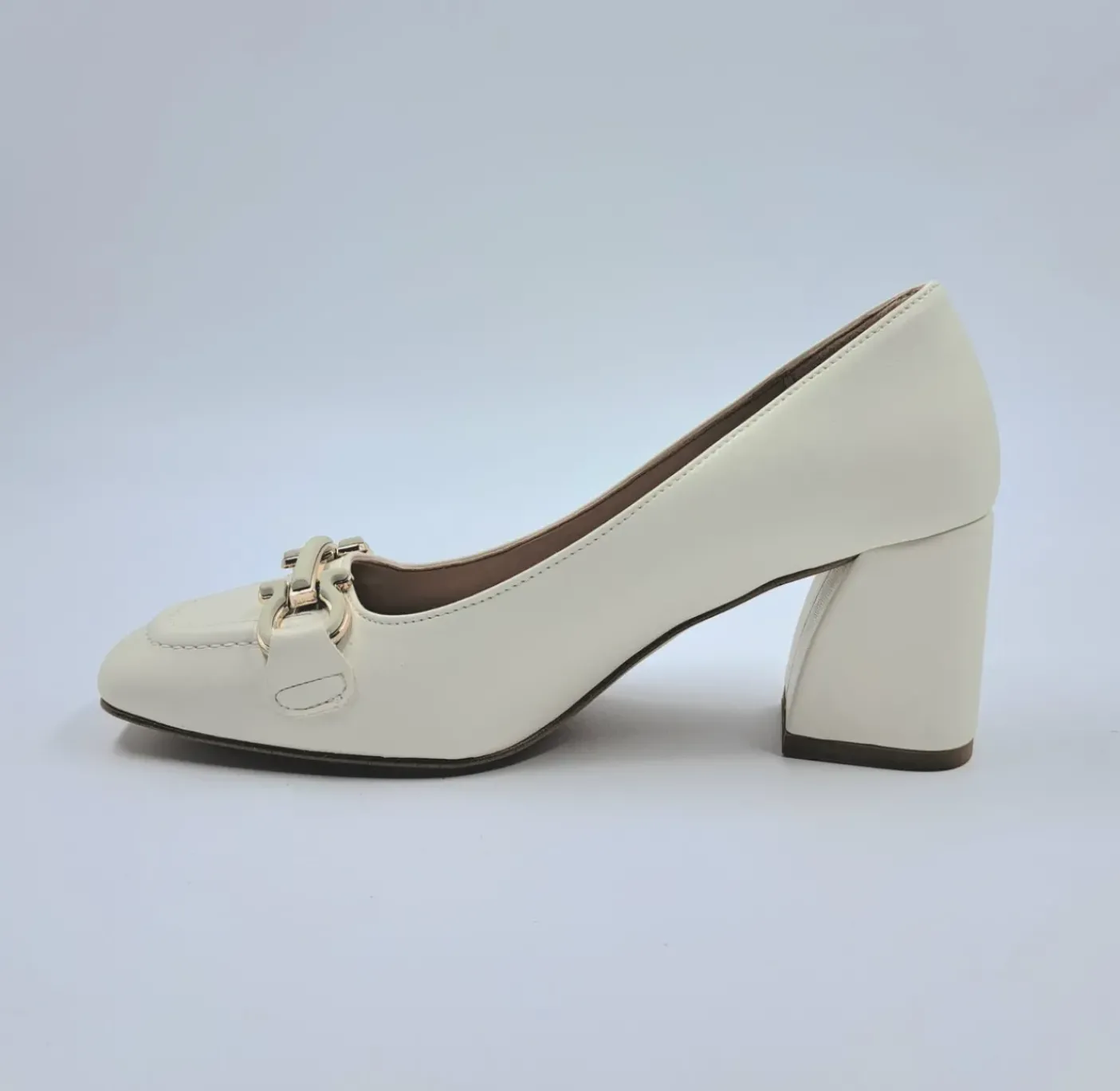Mocassino in ecopelle rivestito internamente in pelle. applicazione metallica color oro e smalto panna. Punta squadrata. Tacco 8cm