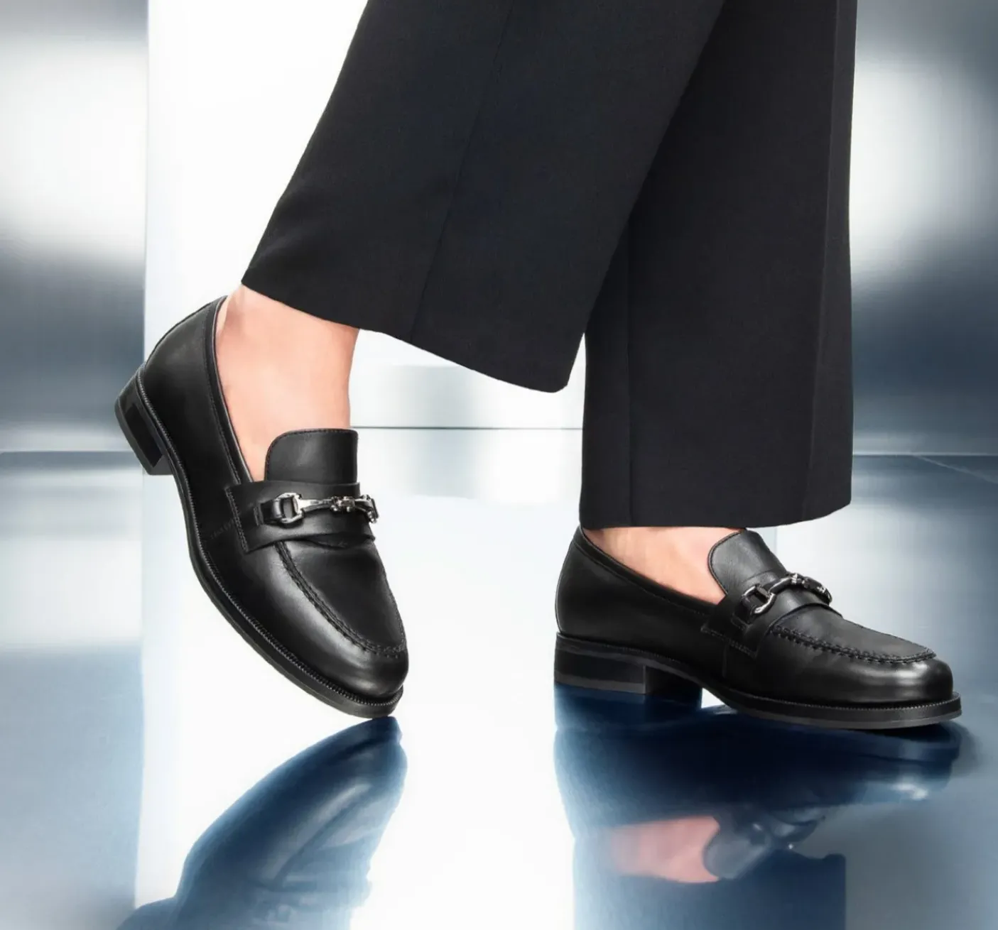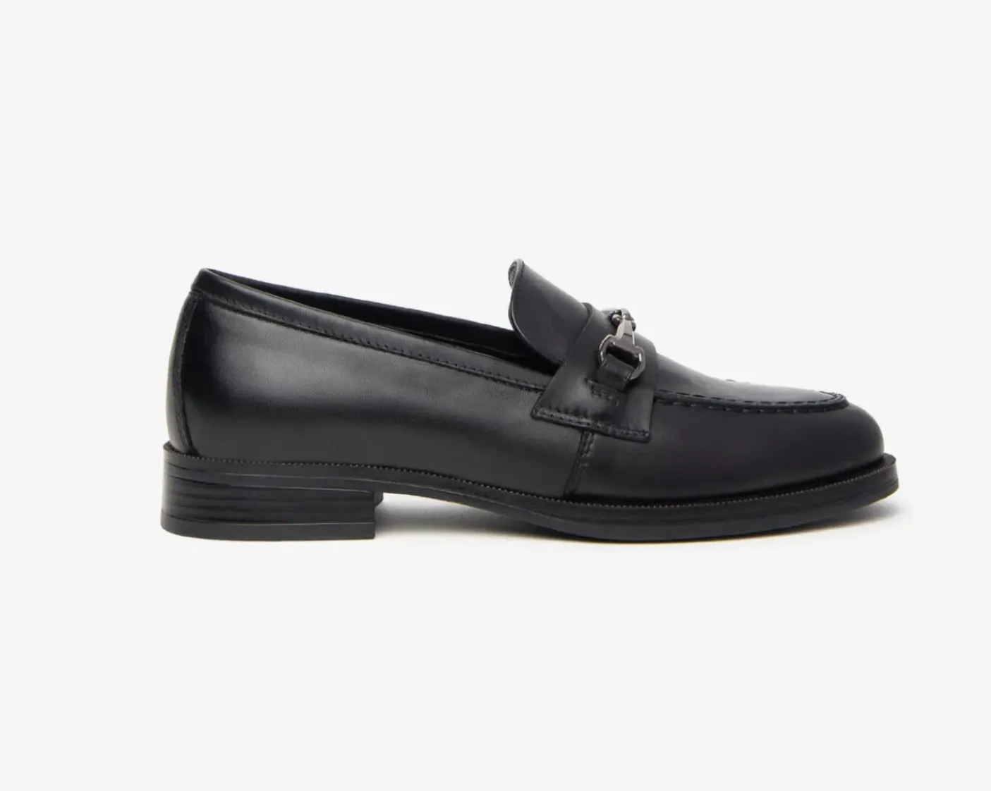 Mocassino in pelle, rivestito internamente in pelle. Soletta in pelle. Applicazione metallica decorativa. Fondo in gomma, tacco 2.5cm.