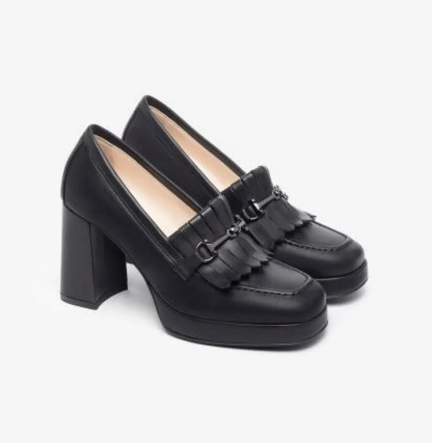 Mocassini in pelle, rivestito internamente in pelle. Decorazione metallica e frange in pelle, Tacco squadrato 9cm. plateau 1,5cm