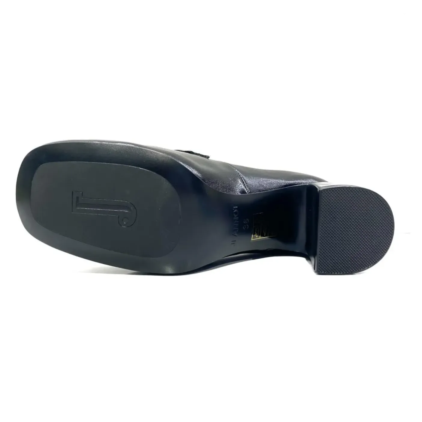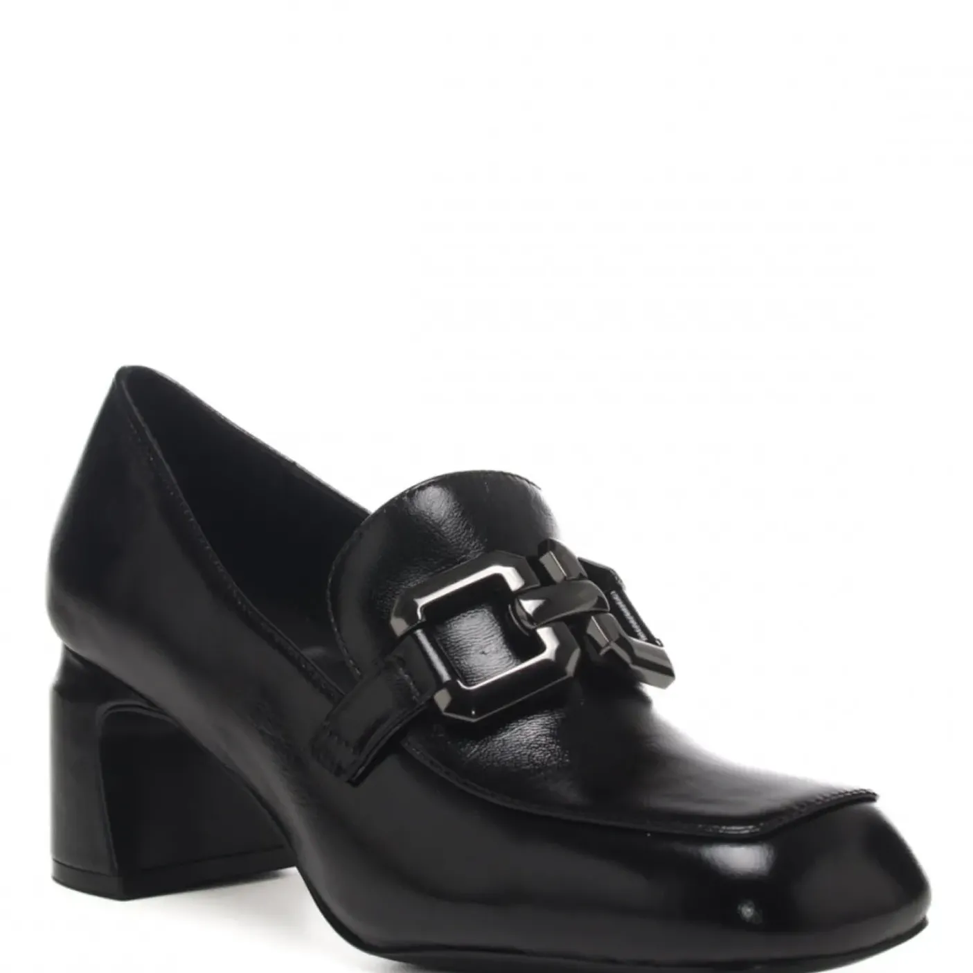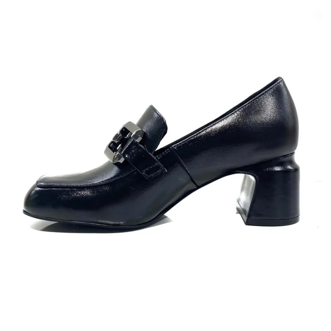 Mocassini in pelle. Rivestito internamente in pelle. Fibbia decorativa metallica. Punta squadrata. Tacco squadrato 6cm