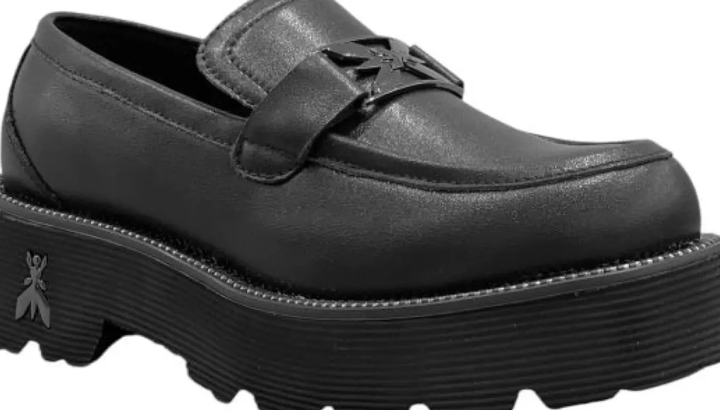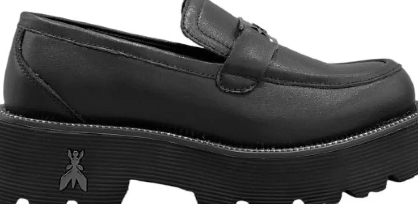 Mocassino in vera pelle con applicazione metallica decorativa logata grigio scuro. Rivestita internamente in pelle. Fondo in gomma 5cm. Mini borchie decorative.