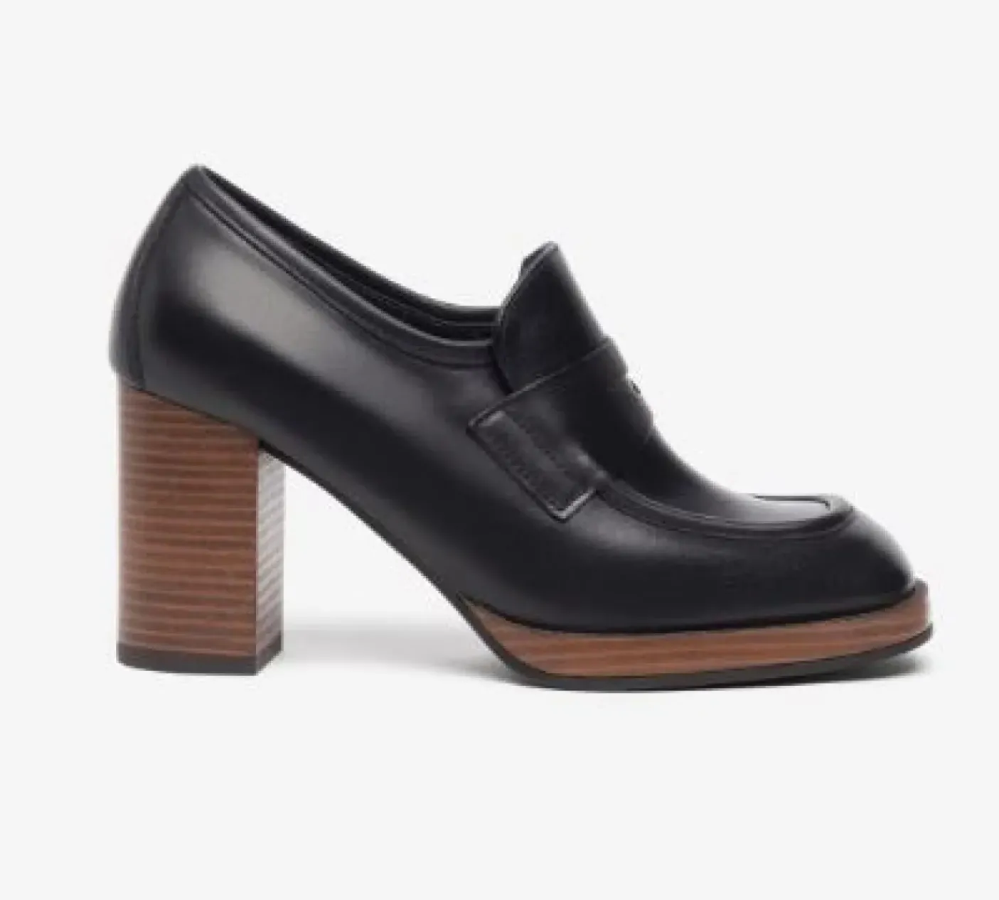 Mocassini in pelle con applicazione catena nera. Rivestito internamente in pelle. Tacco a blocco a contrasto 8cm. Fondo gomma.