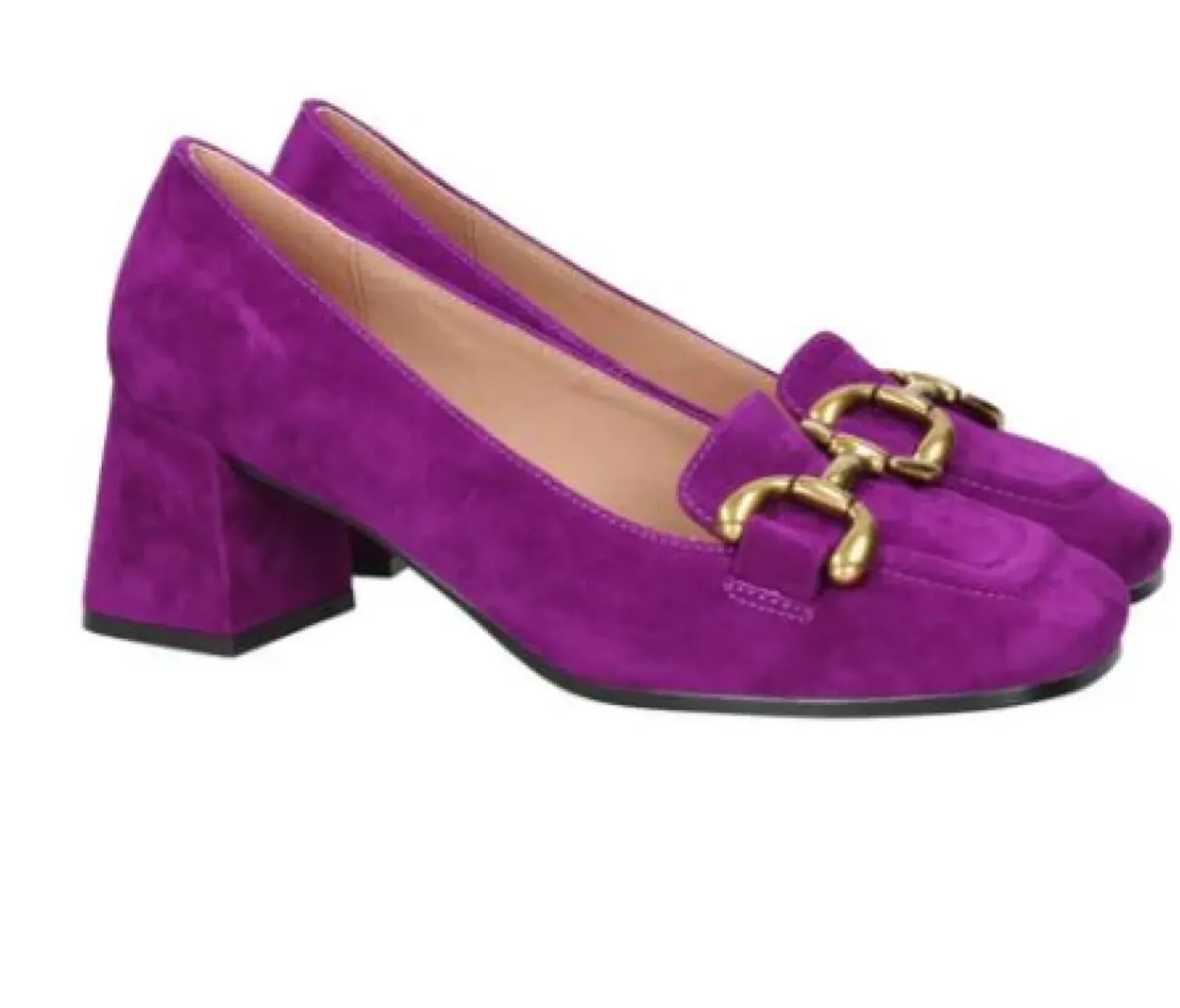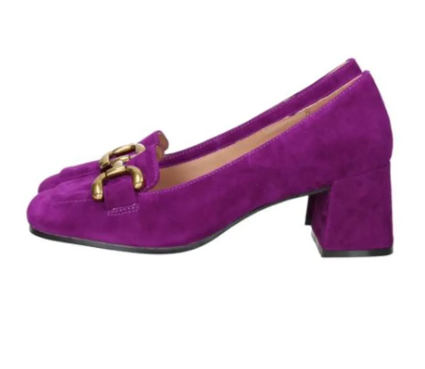 Mocassino in vero camoscio. Rivestito internamente in pelle. Applicazione metallica bronzo. Tacco squadrato 6cm.