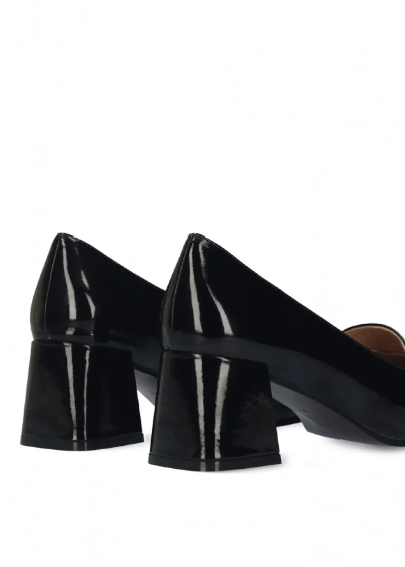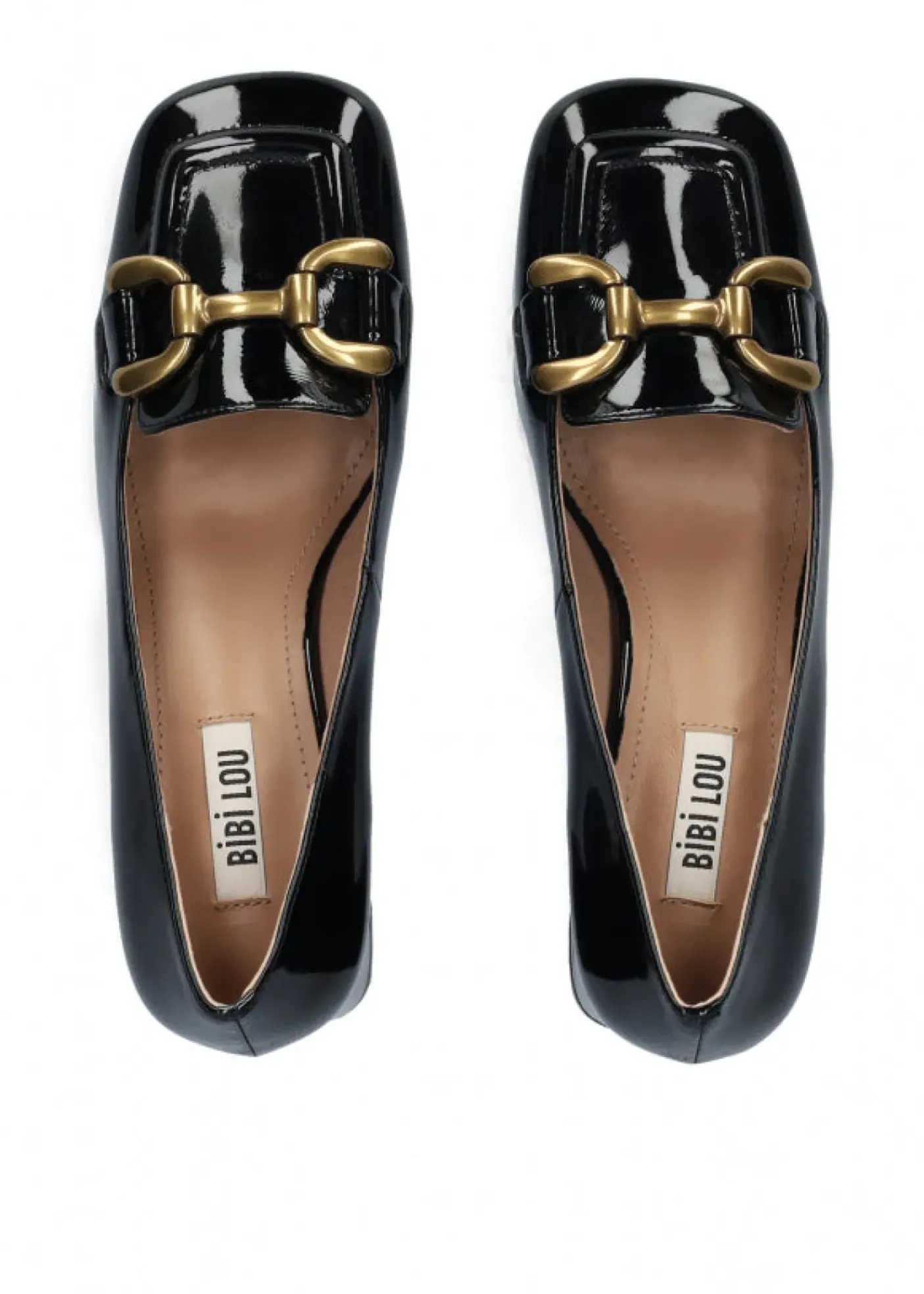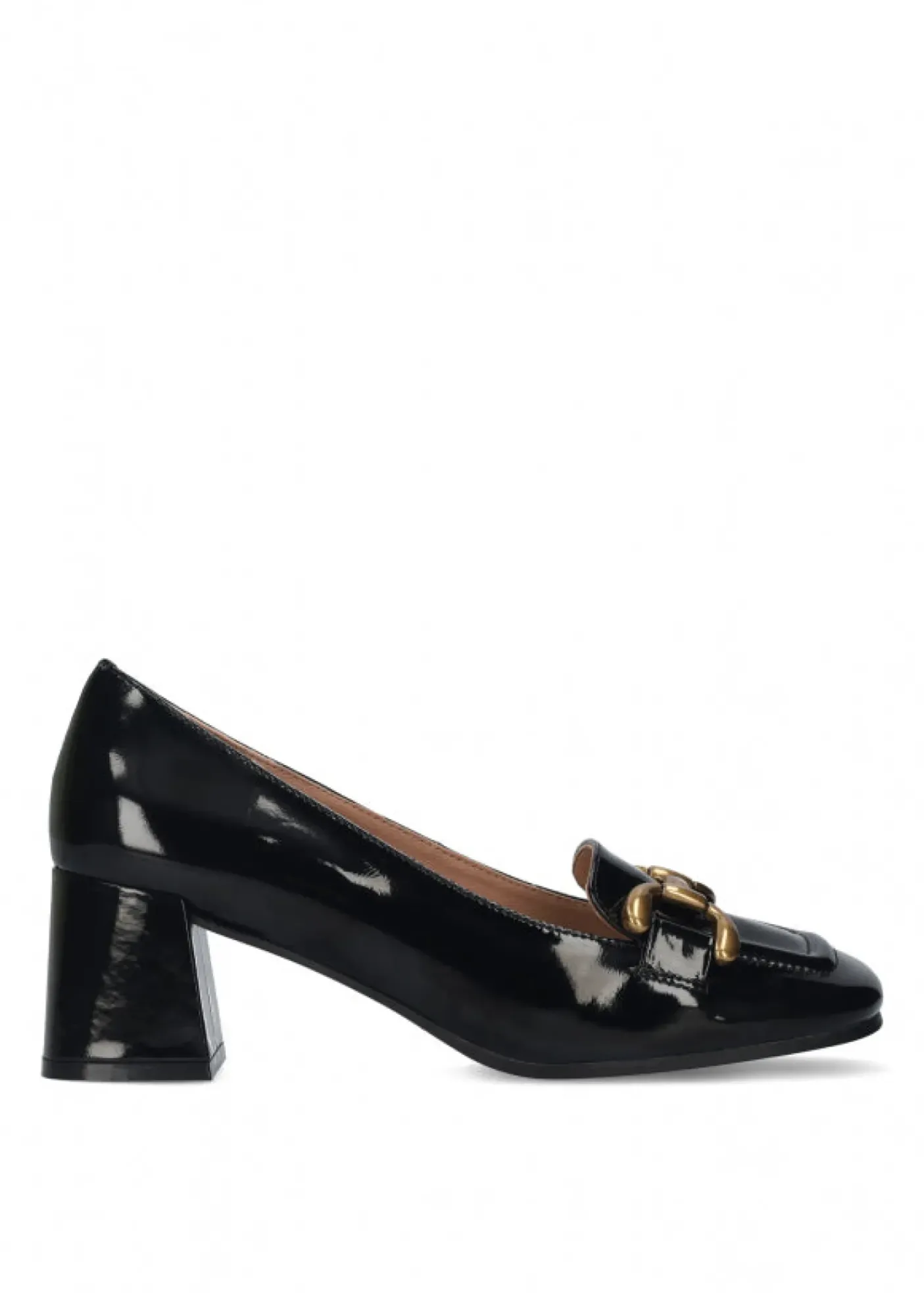 Mocassino in vera pelle lucida. Rivestito internamente in pelle. Applicazione metallica bronzo. Tacco squadrato 6cm.