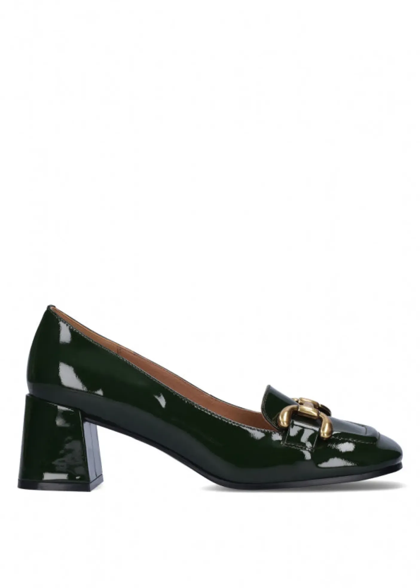 Mocassino in vera pelle lucida. Rivestito internamente in pelle. Applicazione metallica bronzo. Tacco squadrato 6cm.