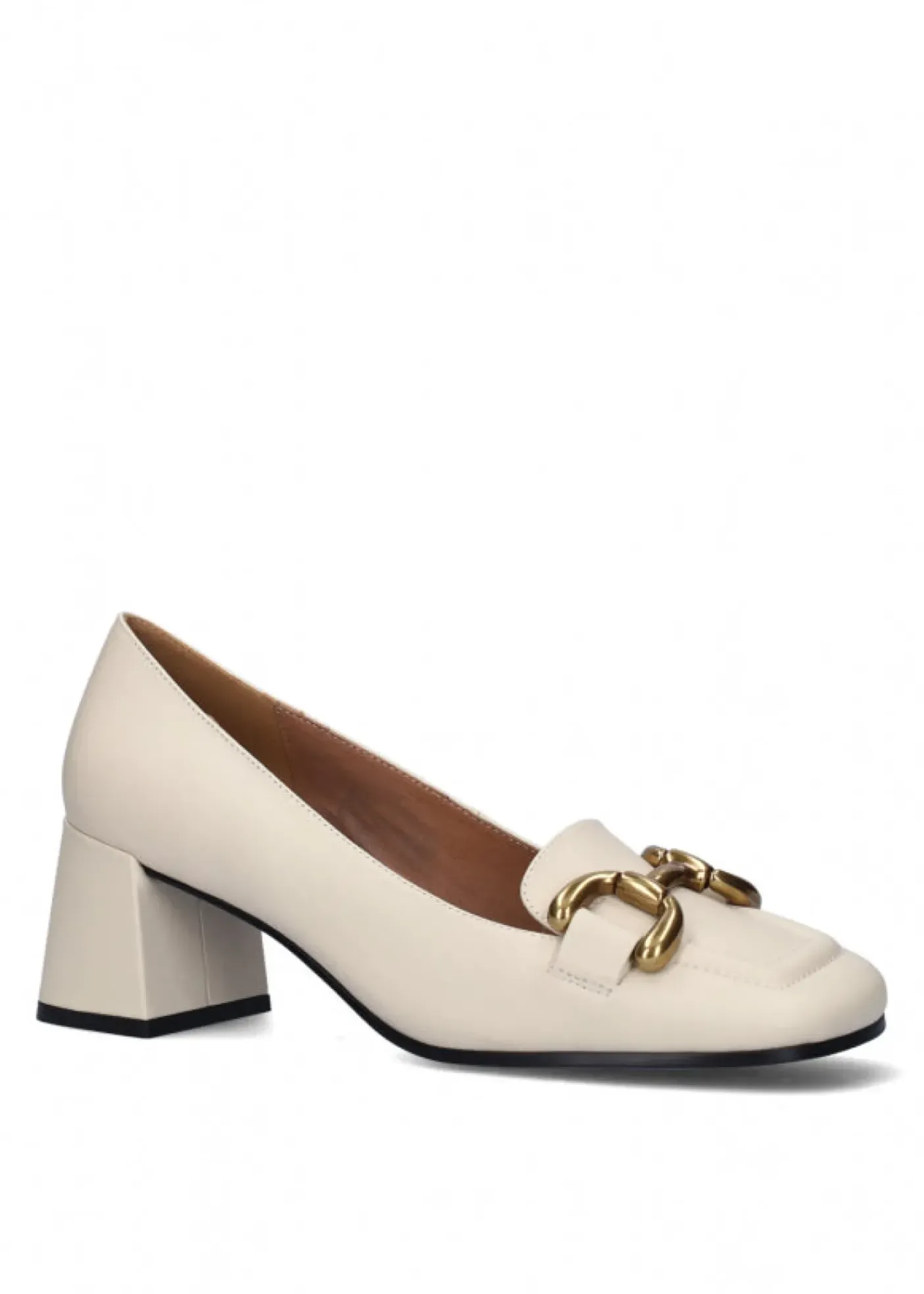 Mocassino in vera pelle morbida. Rivestito internamente in pelle. Applicazione metallica bronzo. Tacco squadrato 6cm.