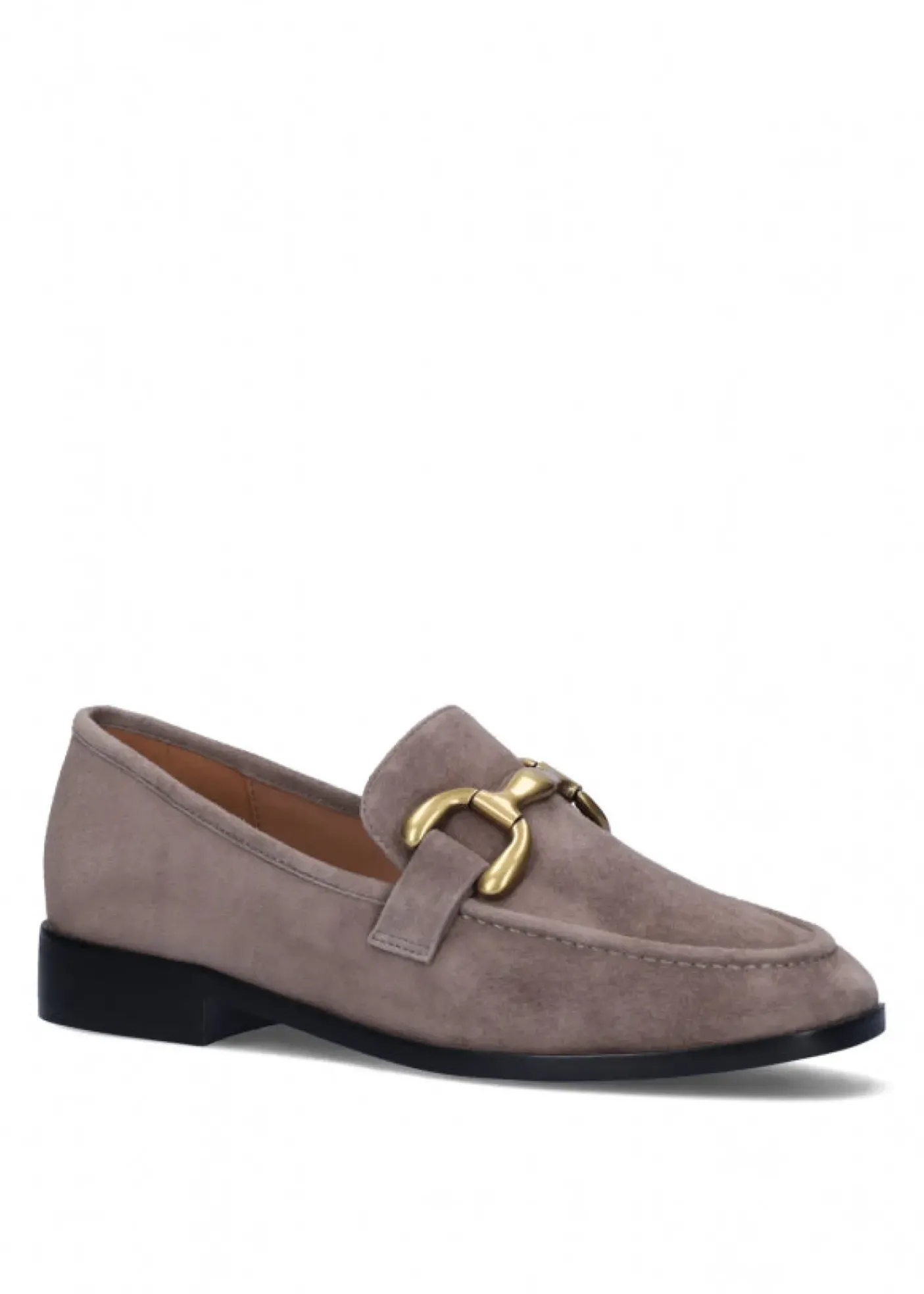 Mocassino in camoscio morbido. Rivestito internamente in pelle. Applicazione metallica. Tacco 2,5cm