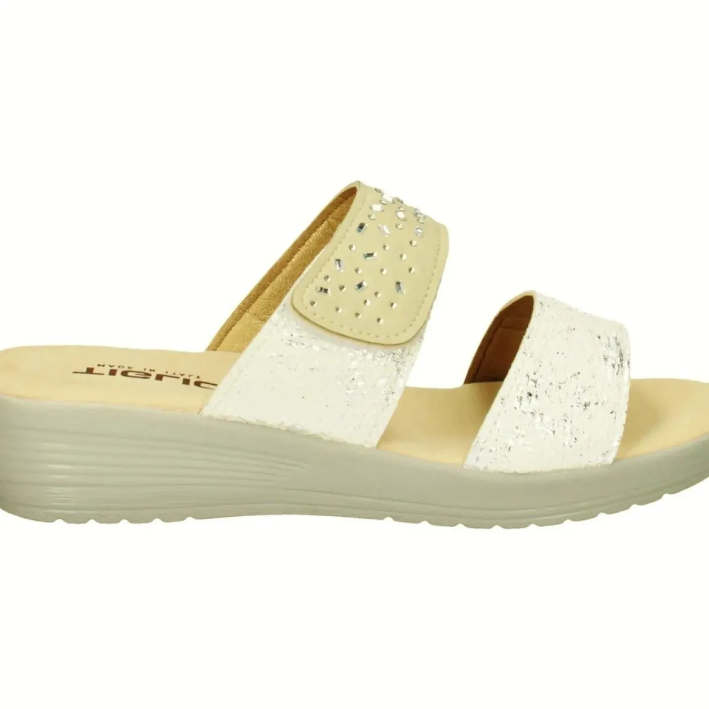 Pantofola con sottopiede imbottito in Vera pelle, tomaia e fasce con micro strass e lux. Chiusura con doppio strappo. Fodera in ecopelle. Suola in PU altezza cm 4
