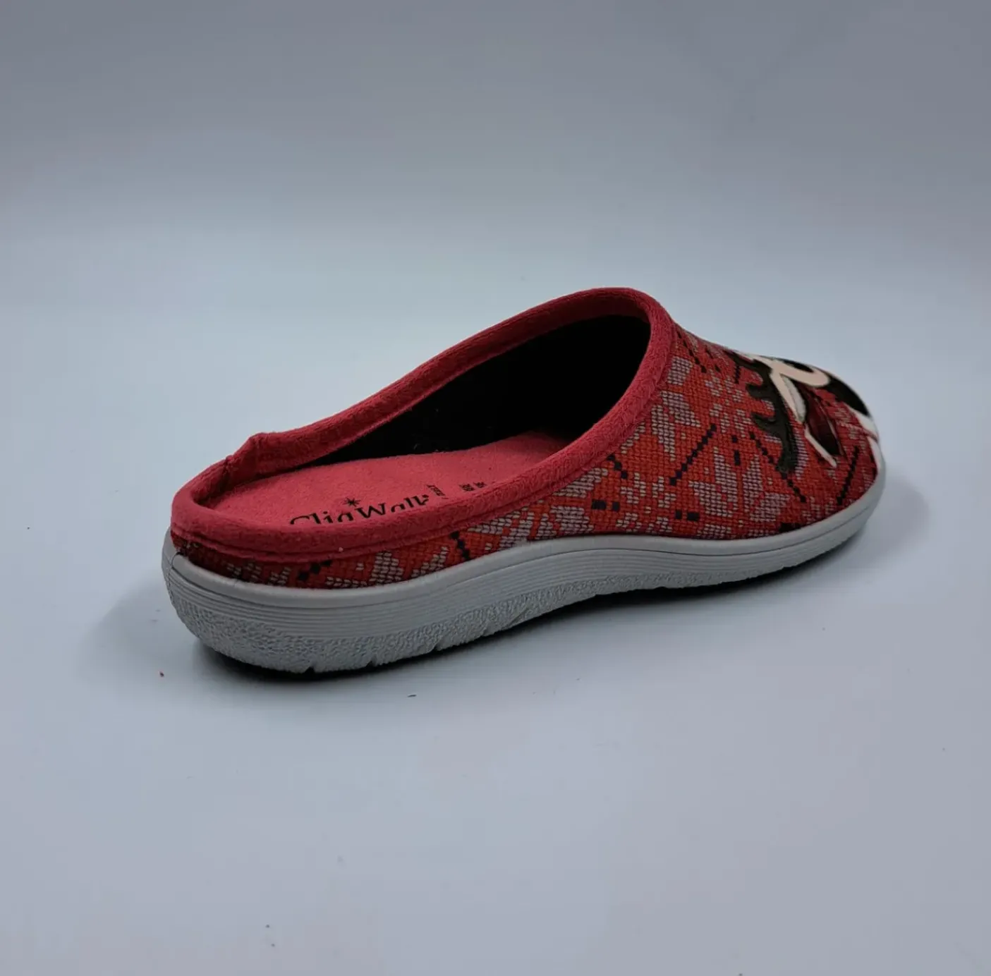 Pantofole in caldo tessuto con stampa renna paesaggio natalizio. Soletta in velluto. Fondo in gomma.