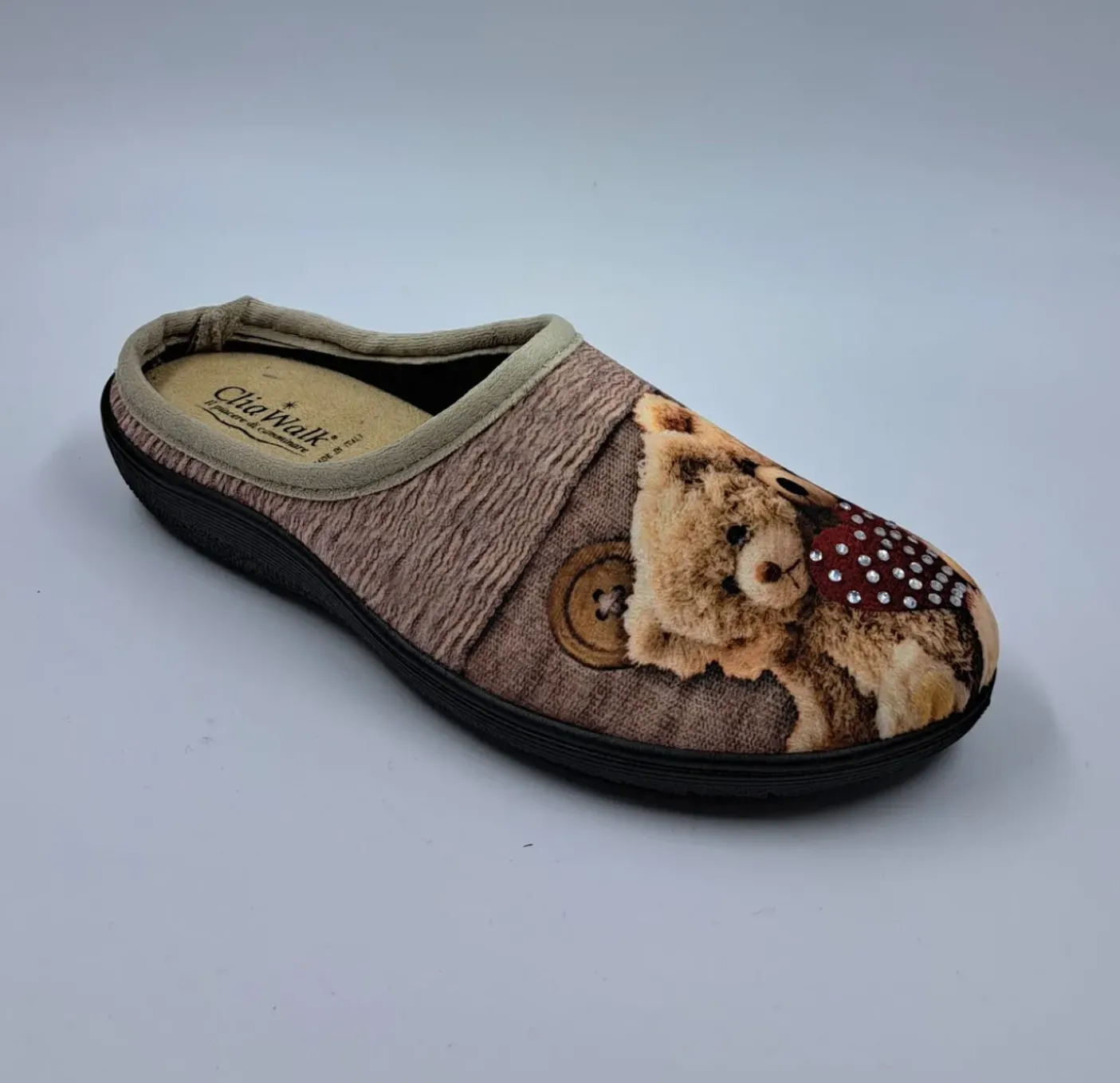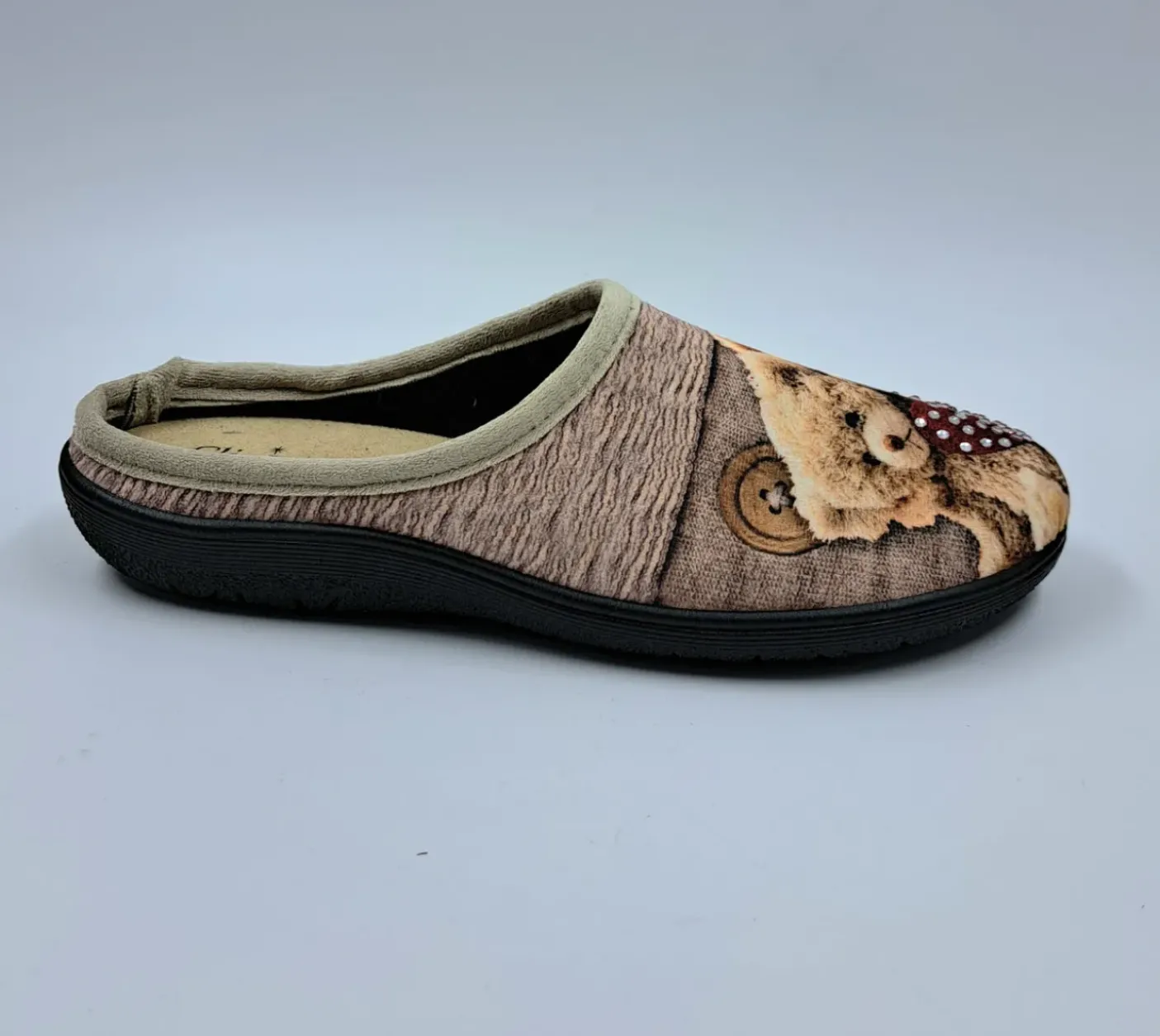 Pantofole in caldo tessuto con stampa orsetti. Soletta in velluto. Fondo in gomma.