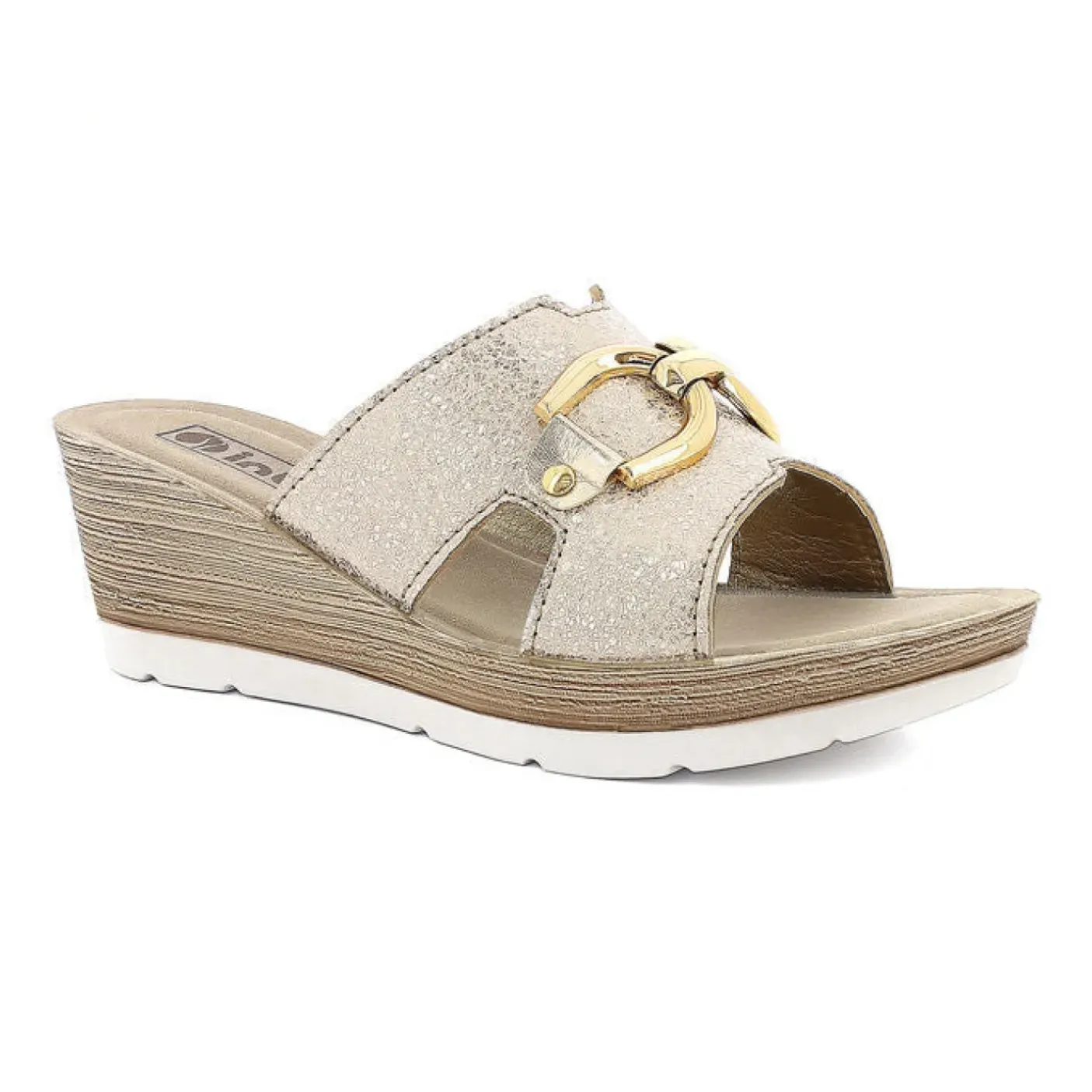 Pantofole a fascia ecopelle con decorazione oro, plantare imbottito ecopelle. Fondo zeppa 6,5cm
