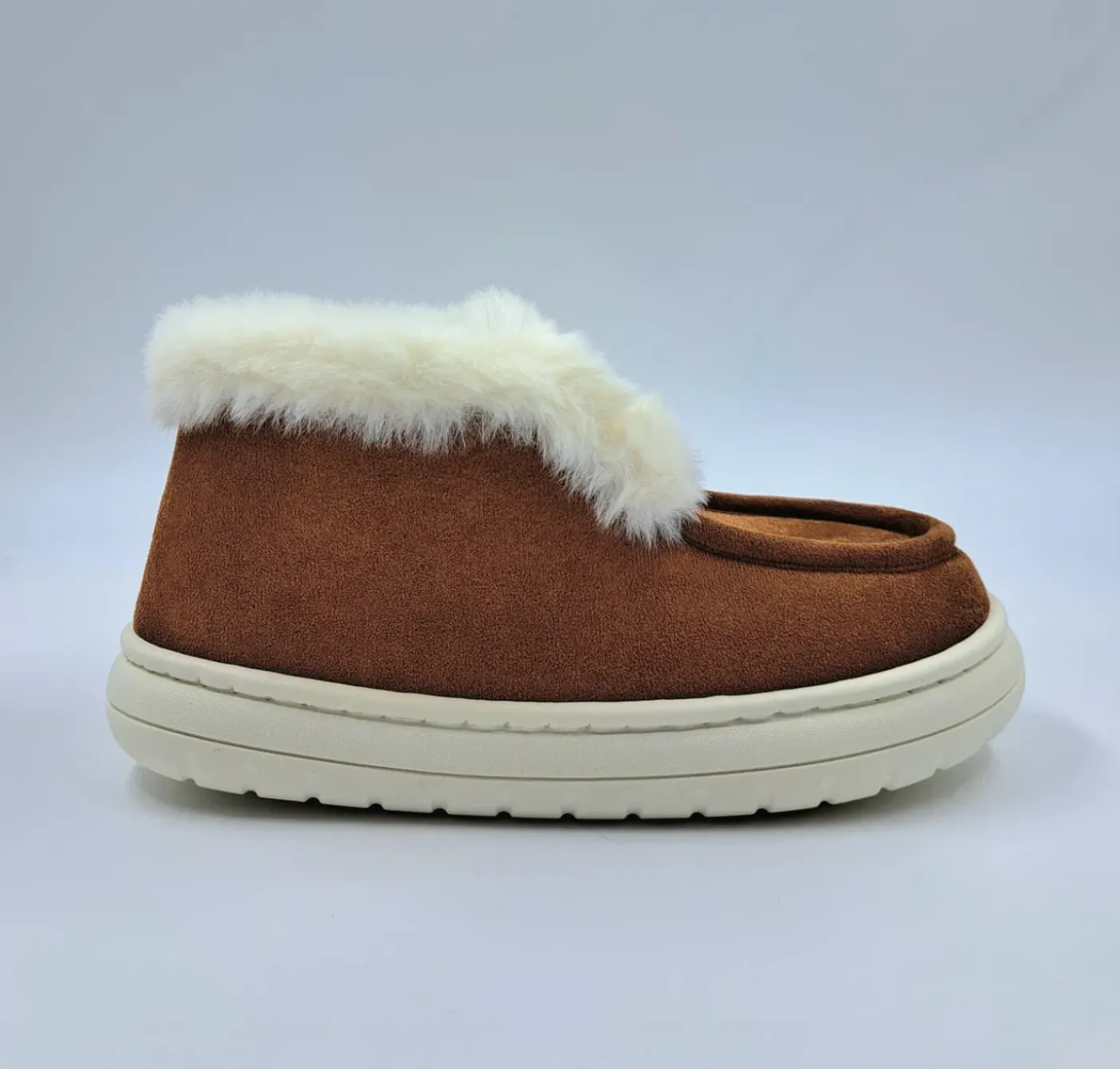 Pantofole in microfibra effetto camoscio. Rivestita con ecopelliccia internamente. Fondo gomma. Ultra leggere.