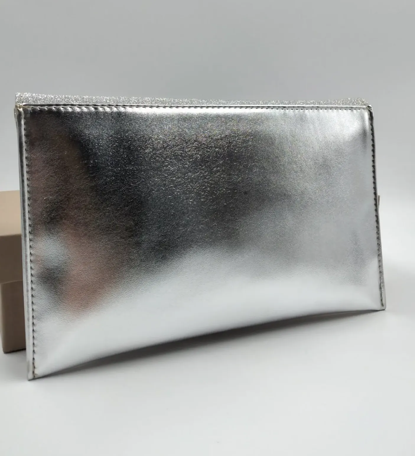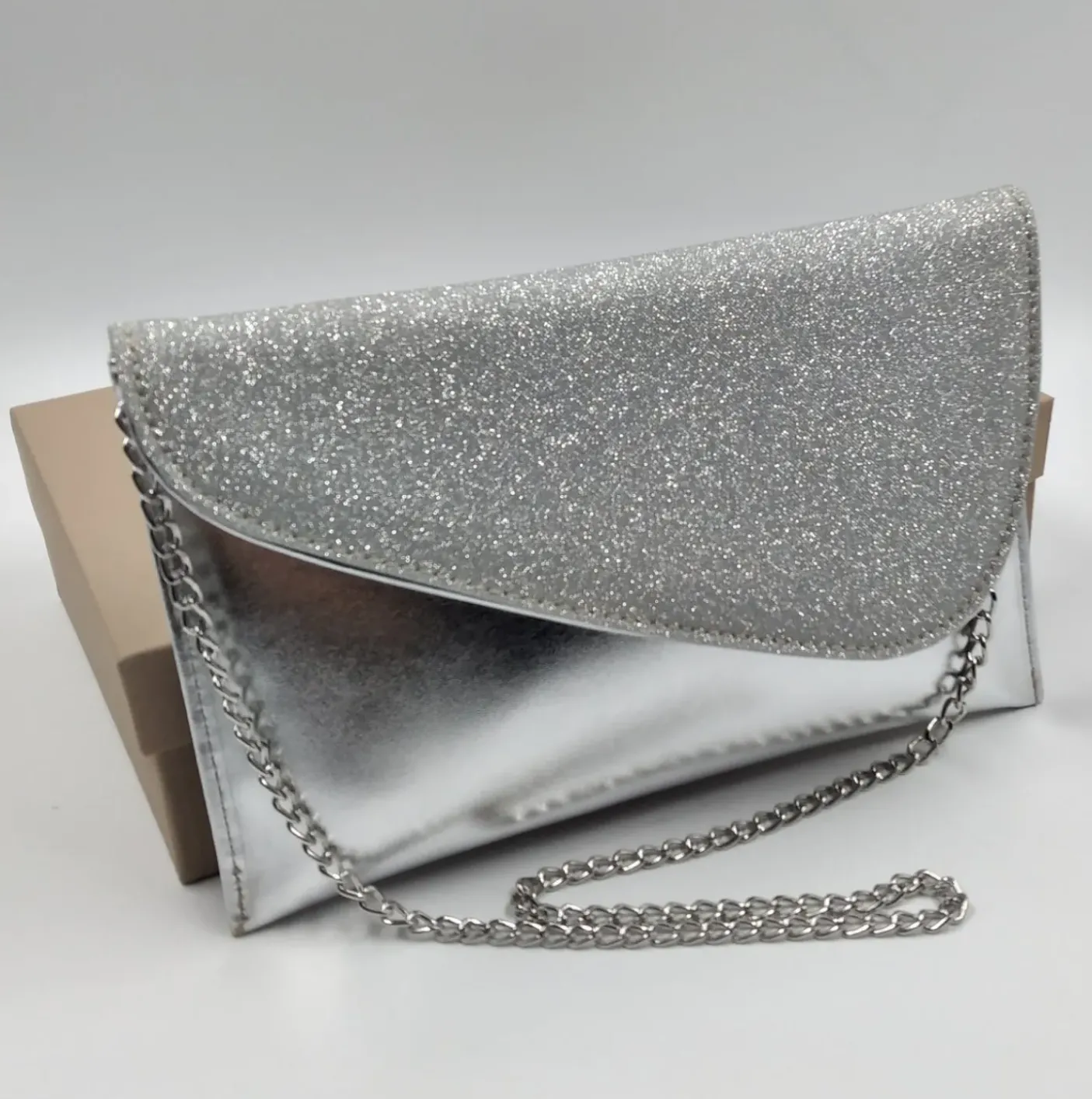 Pochette in ecopelle con patta tessuto glitter. Rivestita internamente in tessuto. Tracolla in metallo argento.
