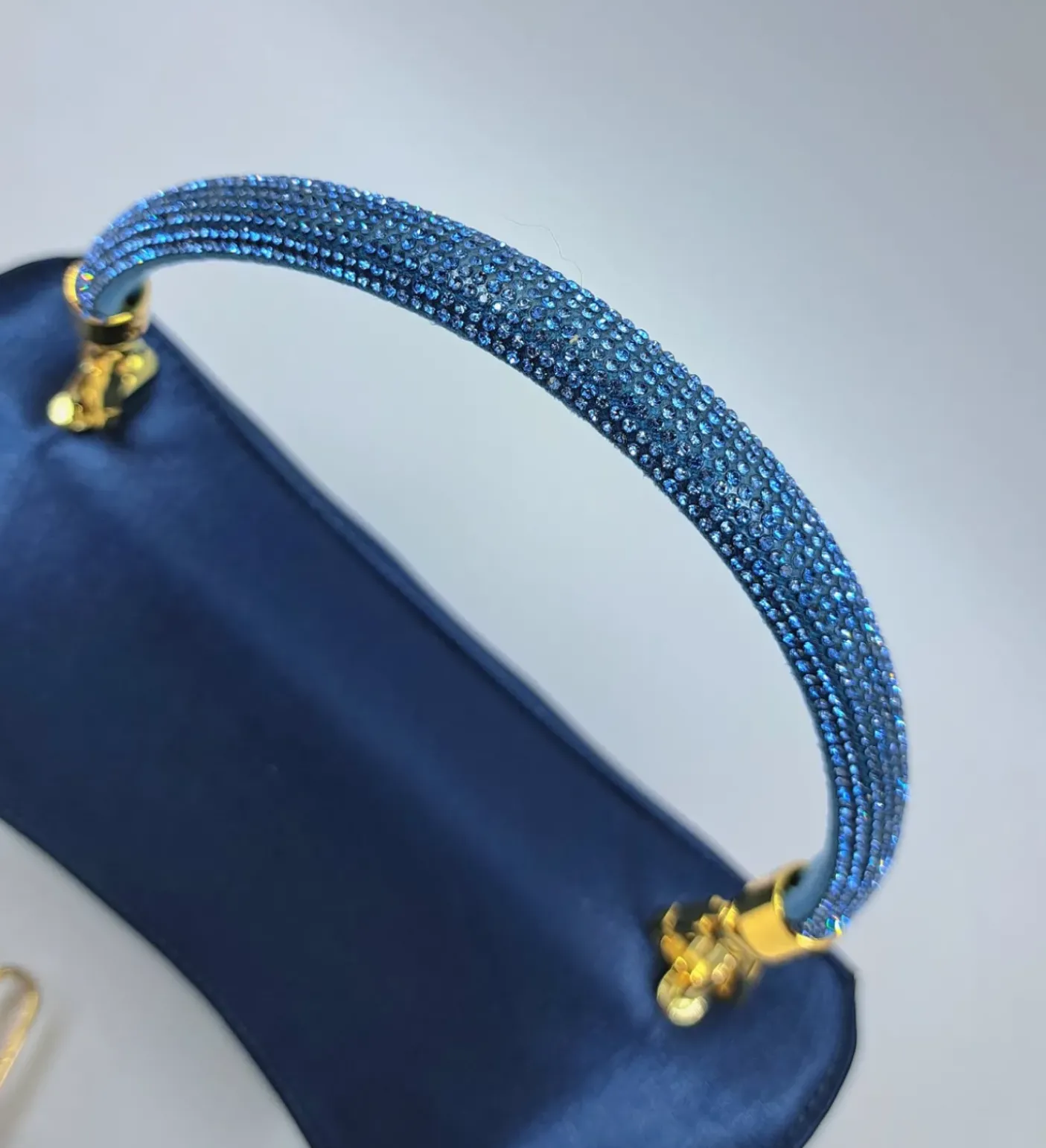 Pochette in raso nero con chiusura a patta con clip. rivestita internamente in tessuto. Dettagli in metallo gold. Doppio manico in strass e tessuto nero removibili.