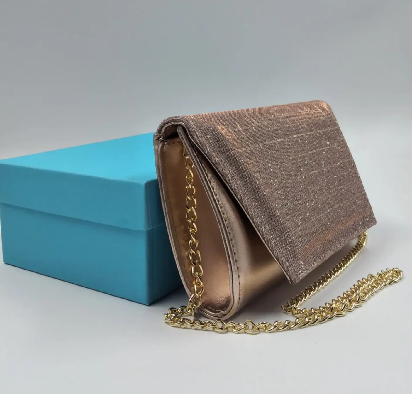 Pochette in ecopelle color rame con patta decorata in tessuto rosa lux. Chiusura con bottone clip. Tracolla metallica oro.